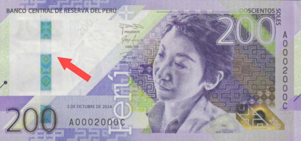 Además del nuevo hilo, el billete mantiene varios sistemas de protección. Al mirarlo al trasluz se aprecia la marca de agua con el rostro de Tilsa Tsuchiya, el número 200 y una figura arquitectónica.
