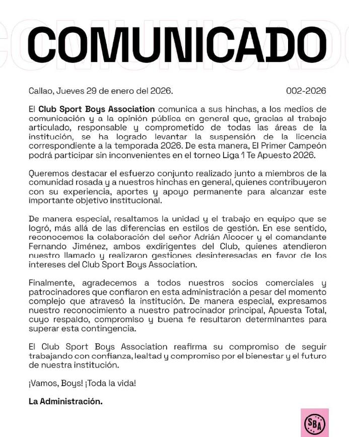 Buenas noticias para el Callao y para toda la hinchada rosada. El Club Sport Boys Association anunció oficialmente que logró levantar la suspensión de su licencia, lo que le permitirá competir sin restricciones en la Liga 1 Te Apuesto 2026, disipando así la incertidumbre que rodeaba el futuro inmediato de la institución.
