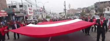 Alzando una gigante tela roja y blanca, el alcalde de Mi Perú, Dr. Irvin Chávez, regidores, directores de instituciones educativas, trabajadores municipales, personal de Serenazgo, bomberos, entre otros,
