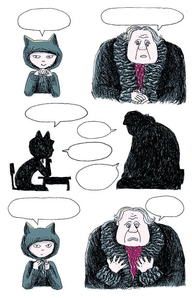 Felina Feline pega seu bloco amarelo com linhas azuis e submete o homem ao questionário padrão da Escola de Detetives.