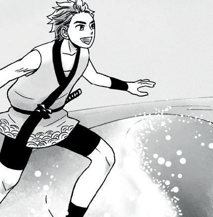 Ali está ele surfando descalço na crista da onda: trajando roupas tradicionais de verão, o garoto com cabelo brilhante todo para cima e um sorriso maior do que tudo. Saindo da boca, um balão de fala: “Han Nami desu!!! Sou Meia Onda!!! Farei o melhor que puder”.