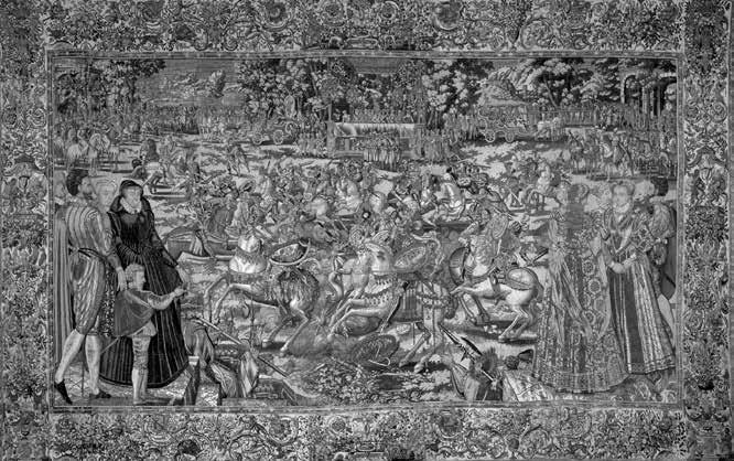 Tapeçaria de Valois, “Tournament”; ateliê desconhecido, 1576. À esquerda, Catarina está em pé com a filha, Marguerite de Valois, e o marido da filha, Henri de Navarra (futuro rei Henri IV da França). Eles olham as figuras à direita, que incluem Louise de Vaudément, esposa do filho de Catarina, Henri III da França, e o próprio rei, atrás dela e de perfil. © Uffizi gallery Via Wikimedia Commons.