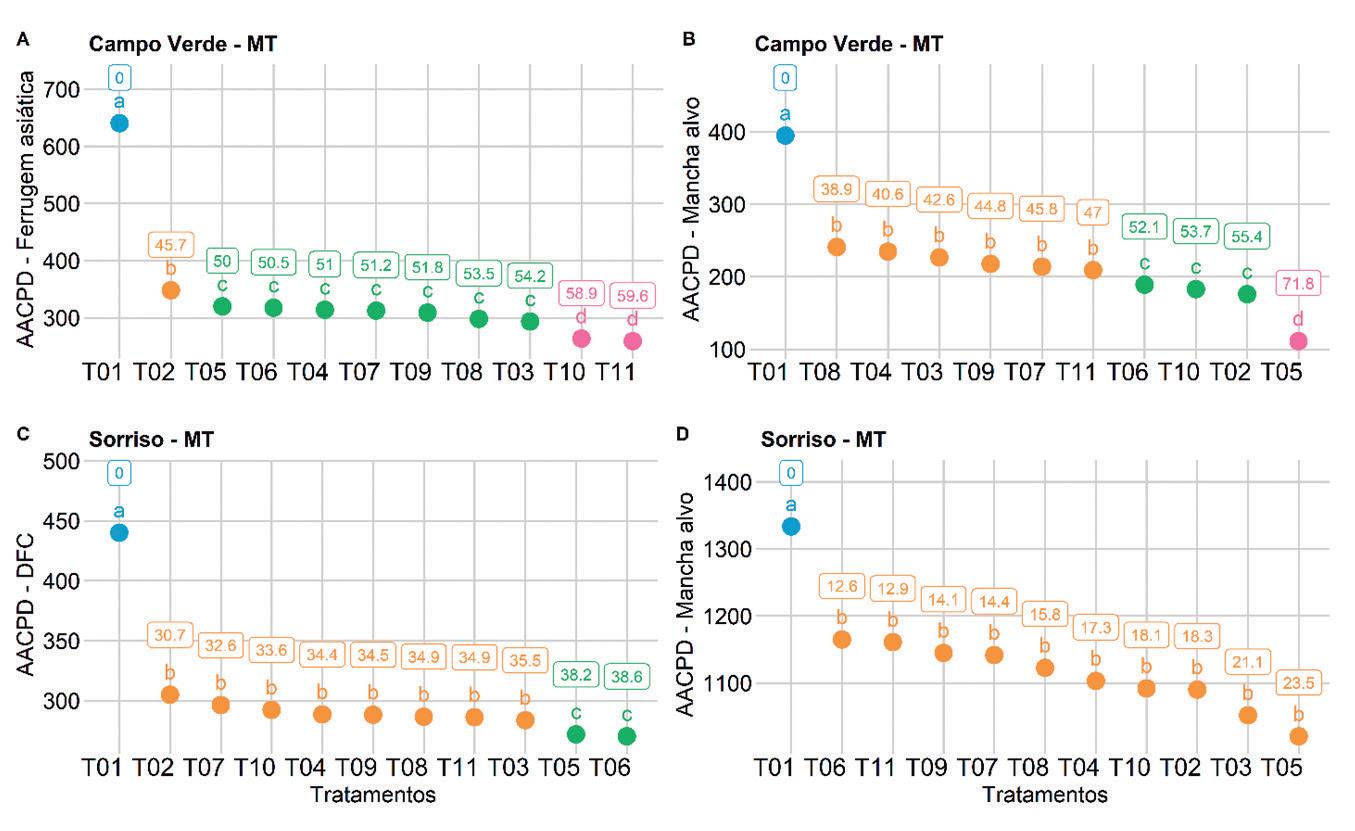 As aplicações iniciaram-se no pré-fechamento das linhas, aos 45 dias (± cinco dias). O intervalo entre as aplicações foi de 14 dias (± dois dias), totalizando quatro aplicações (com RET). Para a aplicação dos produtos foram utilizados costal pressurizado a CO2 e volume de aplicação de 150L/ha. Para a análise estatística conjunta foram utilizados os dados brutos das avaliações de severidade submetidos à análise de variância e as comparações das médias foram realizadas pelo Teste de Tukey (1953). Para a elaboração dos gráficos foram utilizados os dados de controle (Abbott, 1925), calculados com base nas avalia ções da severidade de doença estimadas com o auxílio de escalas diagramáticas para mancha-alvo (Soares et al., 2009), crestamento foliar de cercospora (Martins et al., 2004) e ferrugem-asiática (Godoy et al., 2006). Para o cálculo do controle de cercosporiose, foram consideradas as avaliações realizadas entre os estádios fenológicos R5 e R6 (Fehr; Cavinness, 1977), e para a mancha-alvo e a ferrugem-asiática, considerada a Área Abaixo da Curva de Progresso da Doença (AACPD) (Campbell & Madden, 1990).