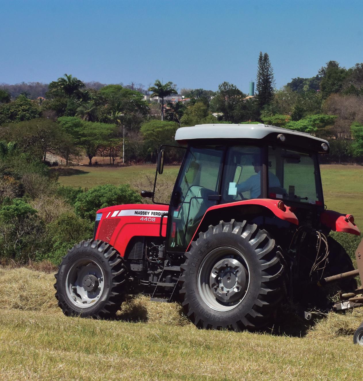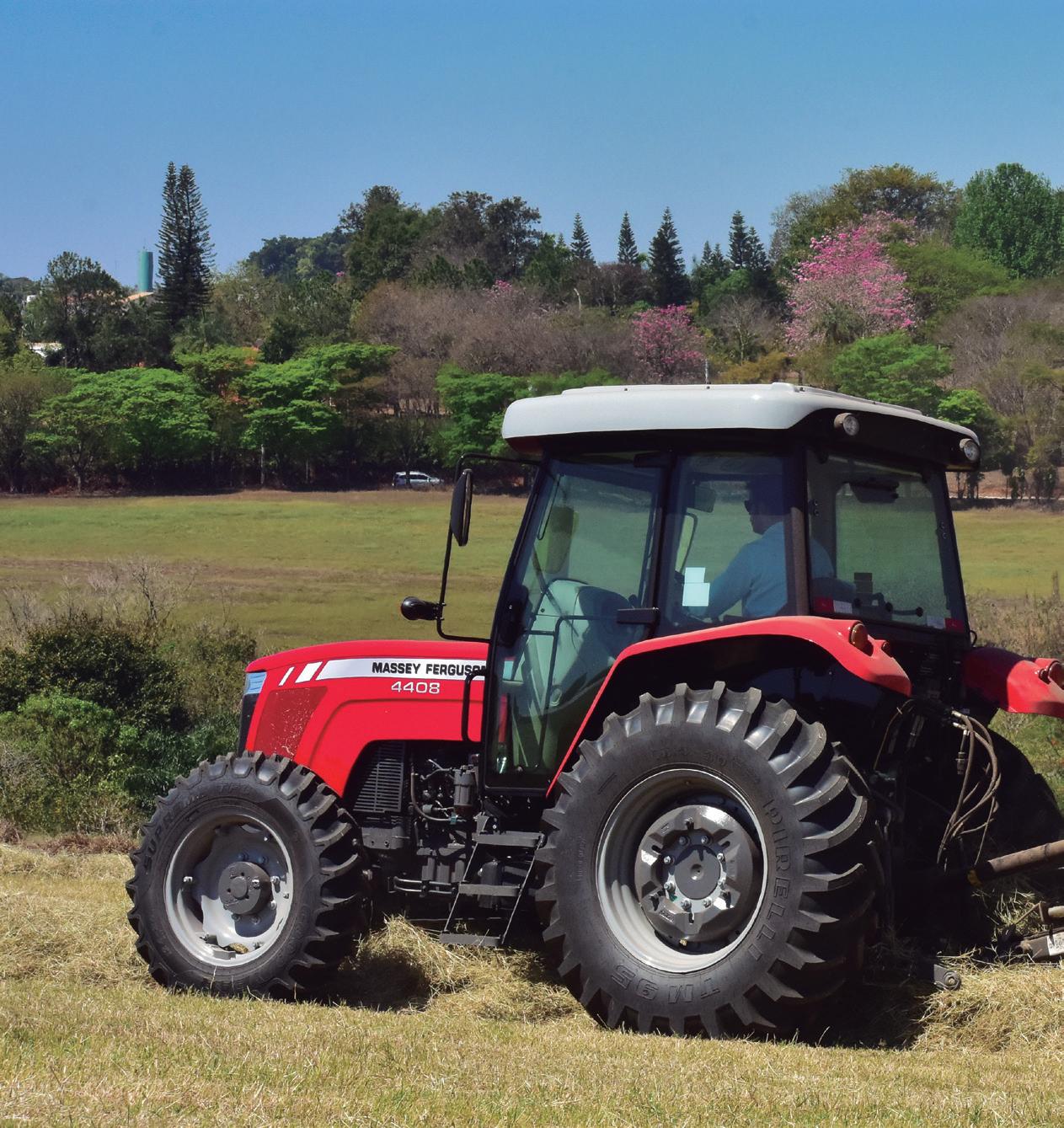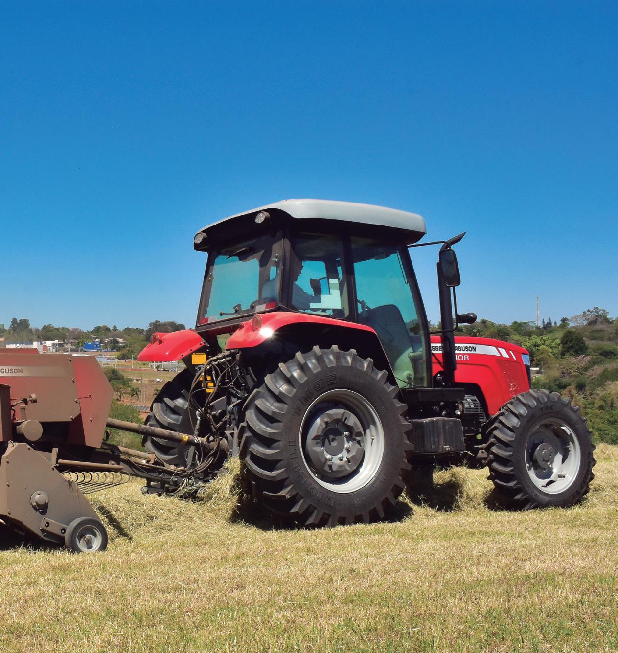 trator e o acionamento dos mecanismos é feito por um eixo cardã que que se liga à tomada de potência (TDP) do trator, em um regime de rotações de 540 rpm. O engate é suportado por um elemento de suspensão, tipo macaco de fuso, que serve para regular a altura de engate e facilitar a operação. O trator utilizado para acionar a enfardadora, cedido pelo concessionário Oimasa, que representa a marca e que também atende a região, com lojas em Orlândia, Ituverava, Franca, em São Paulo, e Itumbiara, em Goiás, era um Massey Ferguson, modelo MF 4408, de 89 cv de potência máxima a 2.000 rpm e um torque de 330 Nm a 1.500 rpm. Para o acionamento da máquina, é necessário que o trator tenha pelo menos 50 cv de potência máxima e duas vias de controle remoto.