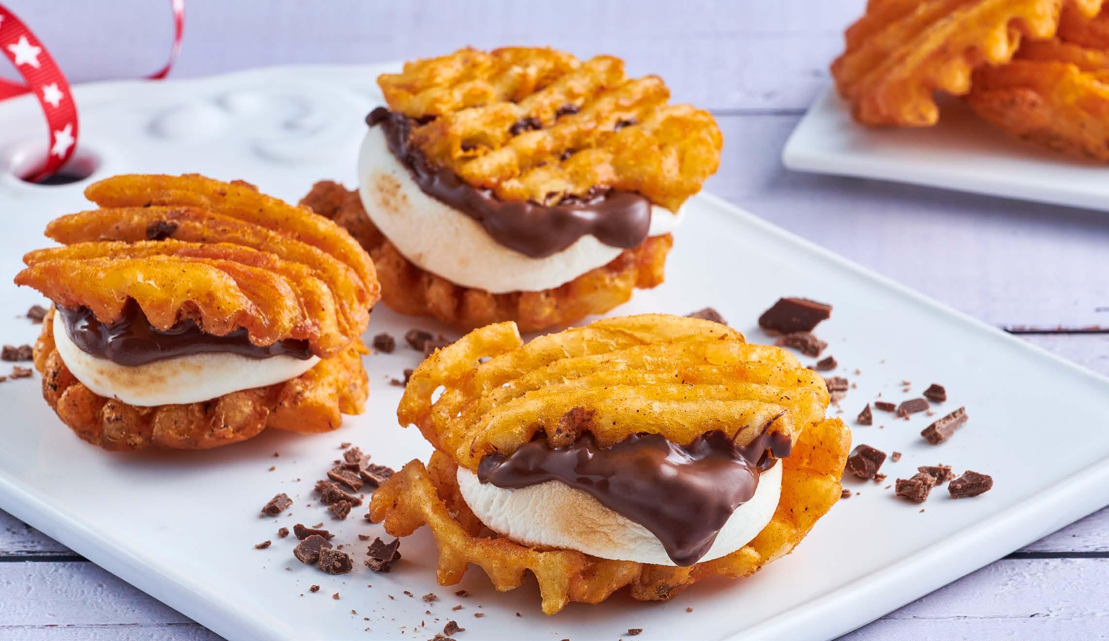 Hornea las papas por 15 minutos a 180°C. Arma sándwiches con los malvaviscos, el chocolate y las papas reja. Hornea nuevamente de 5 a 10 minutos hasta que los malvaviscos y el chocolate estén derretidos.