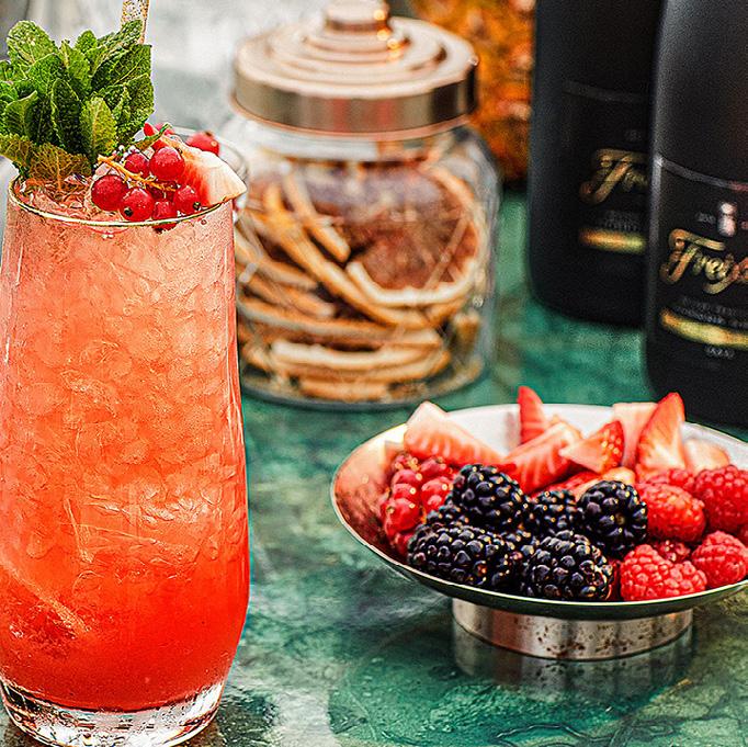 20 ml jugo de limón hojas de menta grosellas rojas hielos
