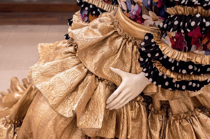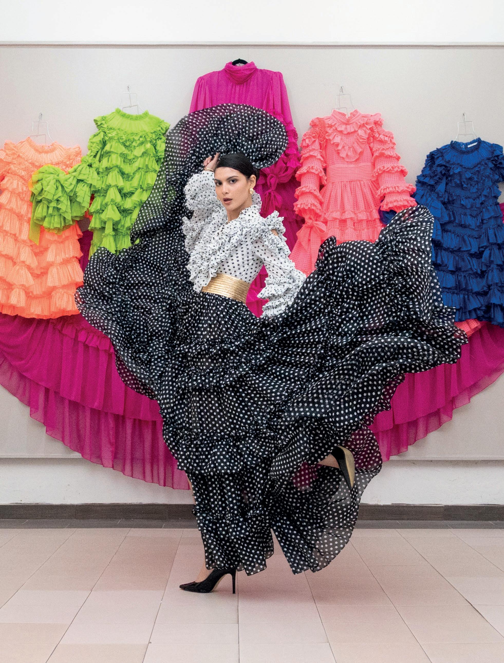 La narrativa se teje a través de volantes dramáticos, texturas exuberantes y estampados en diálogo constante, sellos distintivos de su estética maximalista.
