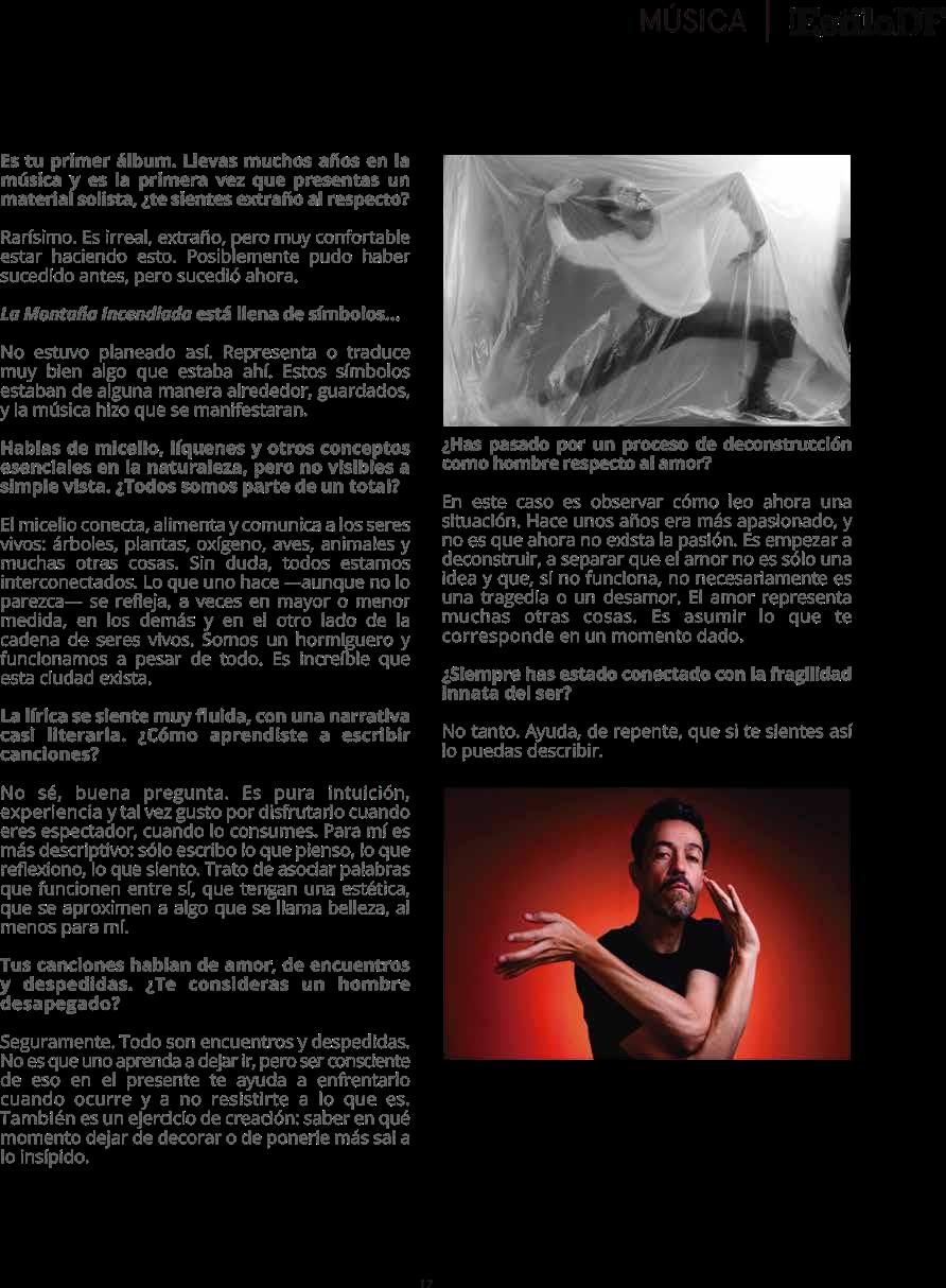 La Montaña Incendiada es un compendio de canciones en las que el integrante de Café Tacvba atiende la necesidad de reír, llorar, cuestionarse y apapacharse Las piezas combinan una lírica sensible con géneros que van del bolero al regional mexicano.