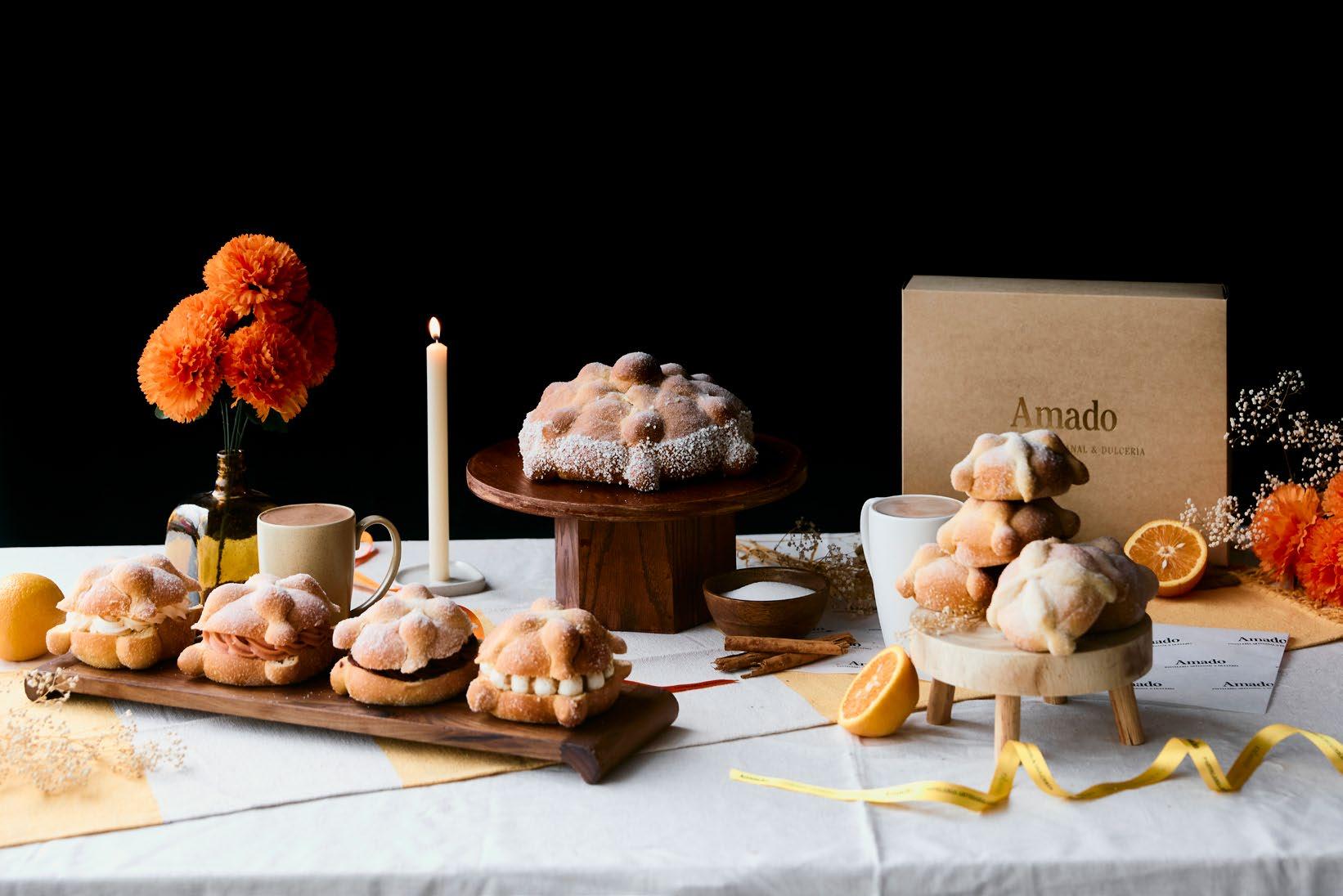 En Amado, la rúbrica de las recetas se saborea a través del cuidadoso encuentro entre los procesos fundamentales de la panificación y la experimentación de la pastelería contemporánea. El resultado son panes elaborados al momento con materia prima local, amasados con cuidado y con respeto a los tiempos de reposo de la masa. El pan de muerto ya está disponible en tres tamaños y cinco versiones, natural y con relleno de nata, chocolate, cajeta y rompope, que pueden disfrutarse en casa o directamente en Amado, acompañado de una taza de café orgánico Buna preparado en su máquina de la casa florentina Marzocco.