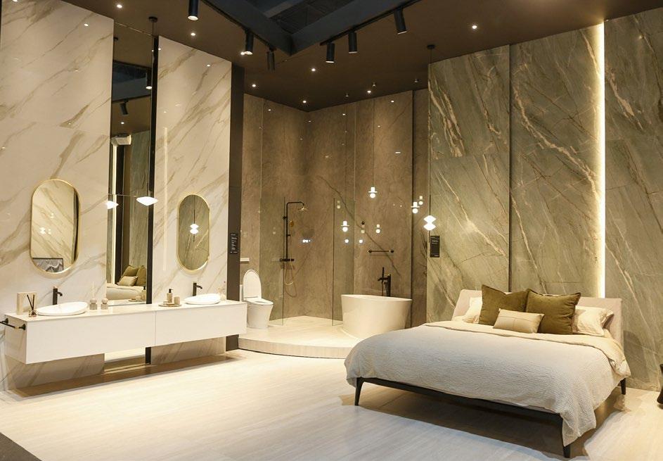 Y aunque las grandes placas de mármol fueron protagonistas durante la exhibición, el ecosistema de Interceramic se completó con mobiliario que también destaca por el uso de tecnología, como los sanitarios y regaderas inteligentes que permiten controlar temperatura y flujo de agua, entre otras funciones.