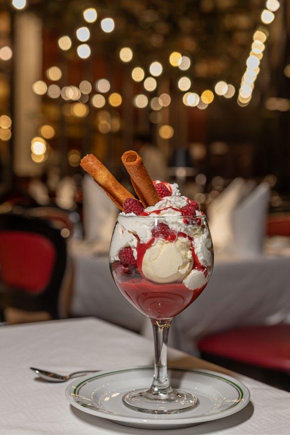 costra de frutos secos, Hambourgeois Au Pied de Cochon, además de melba de frambuesa y helado de vainilla y frambuesa.