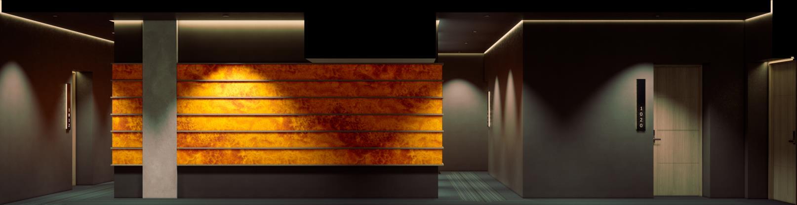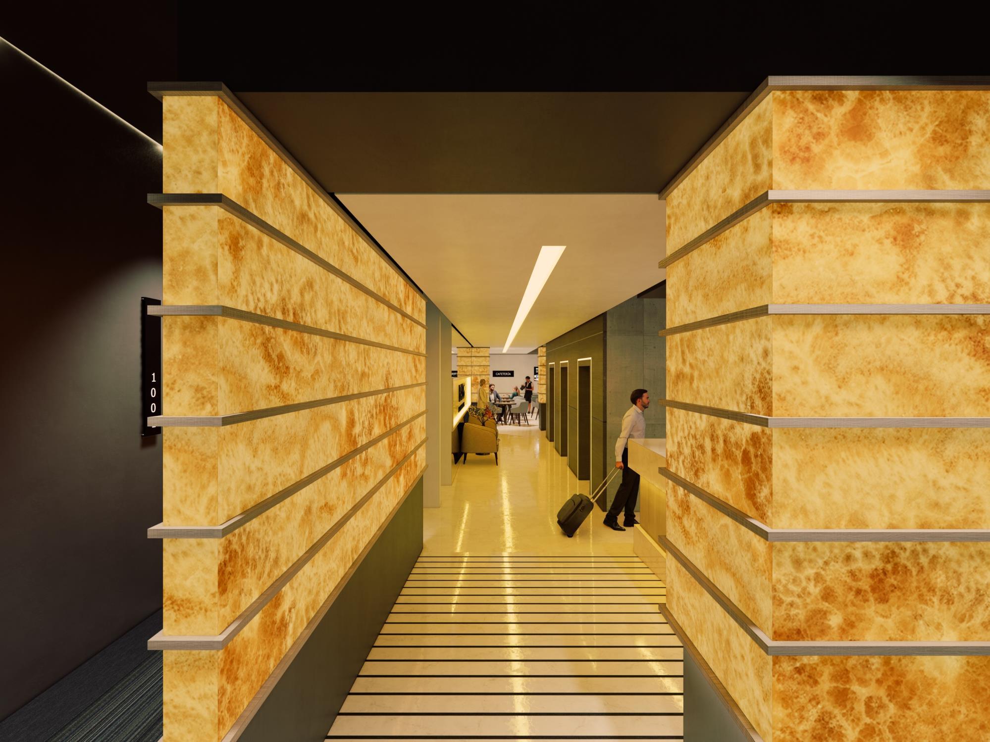 Se propone utilizar los bloques de servicios complementarios como cajas de luz que brinden iluminación ambiental a los pasillos y las áreas comunes del hotel, con un diseño inspirado en las antiguas lámparas japonesas de papel, cuya luz generaba un ambiente cálido y tranquilo.