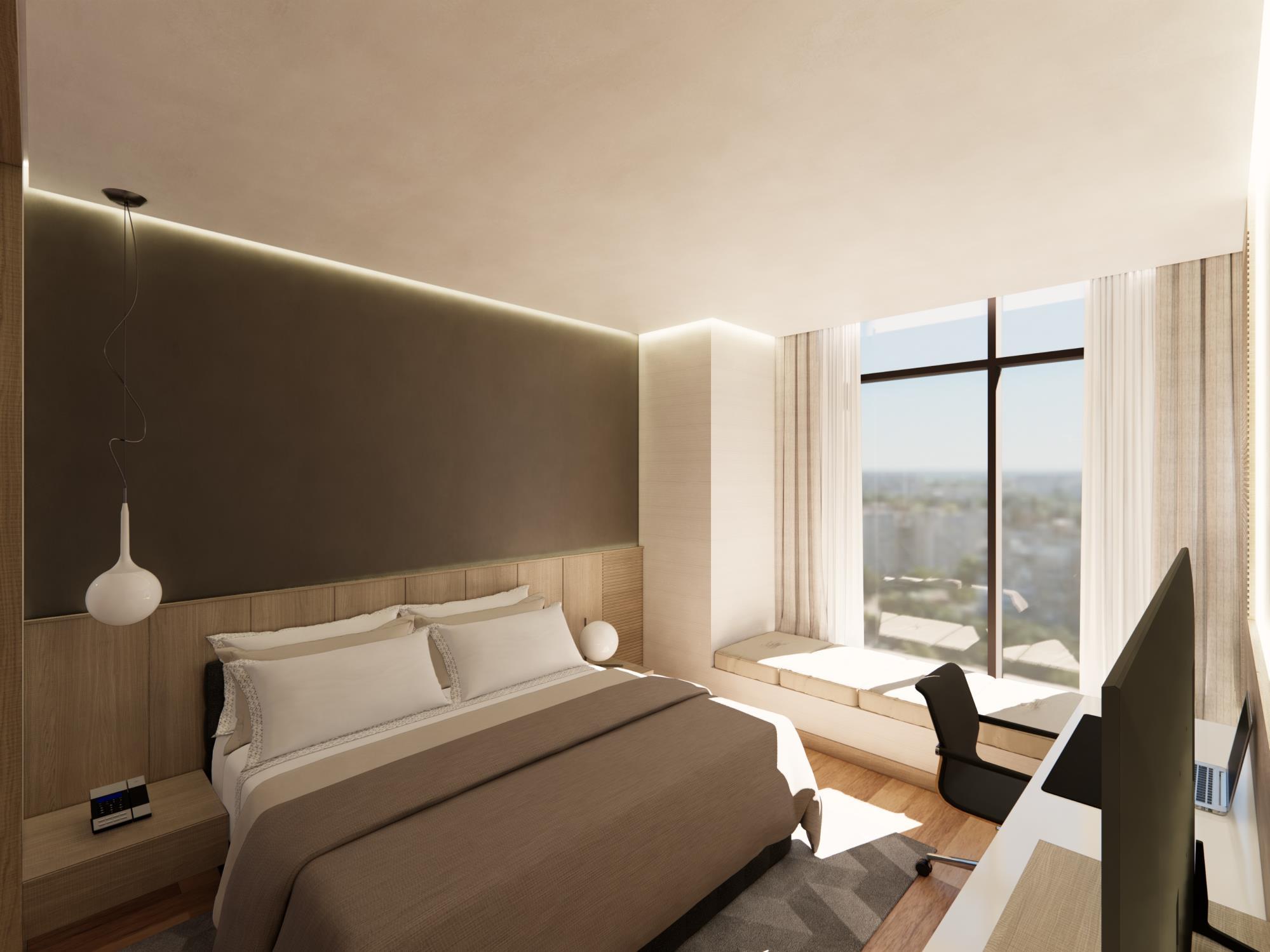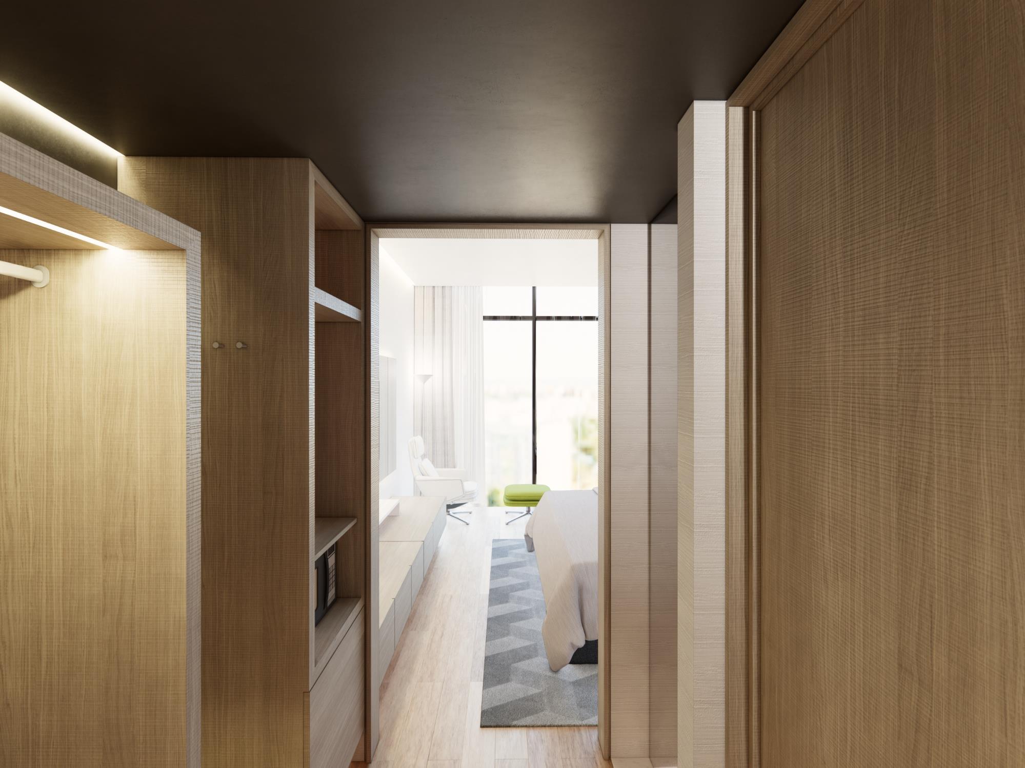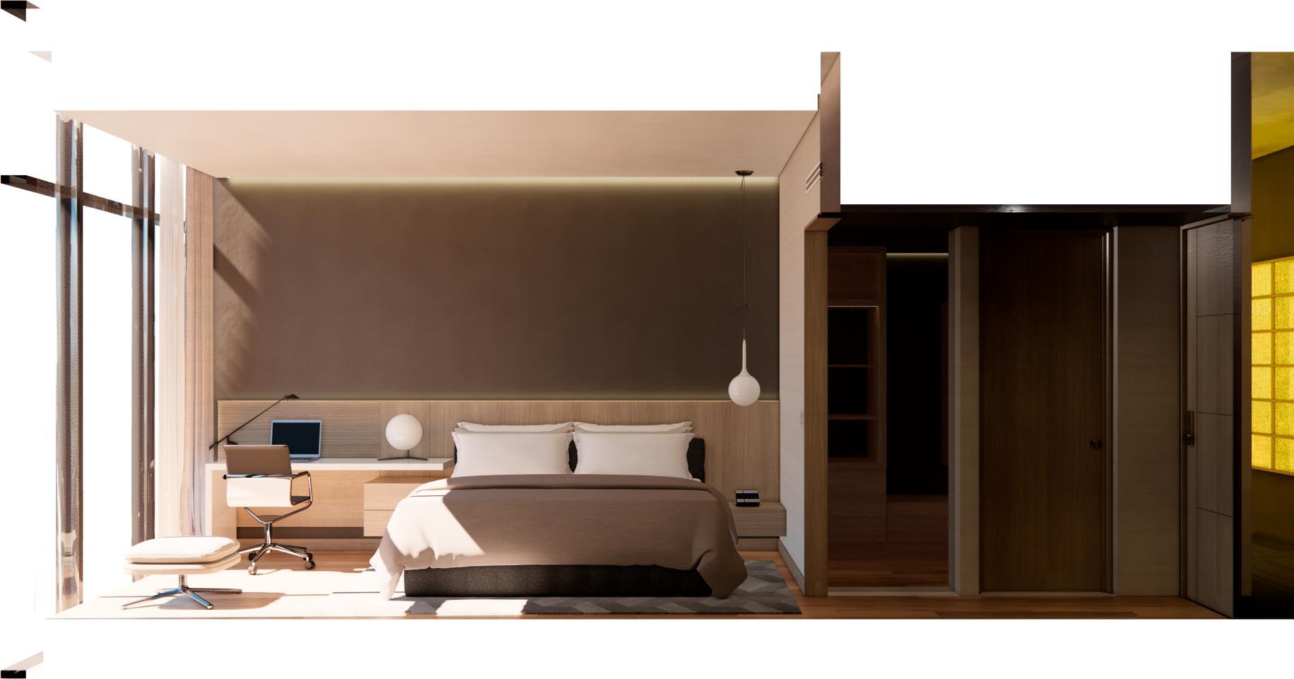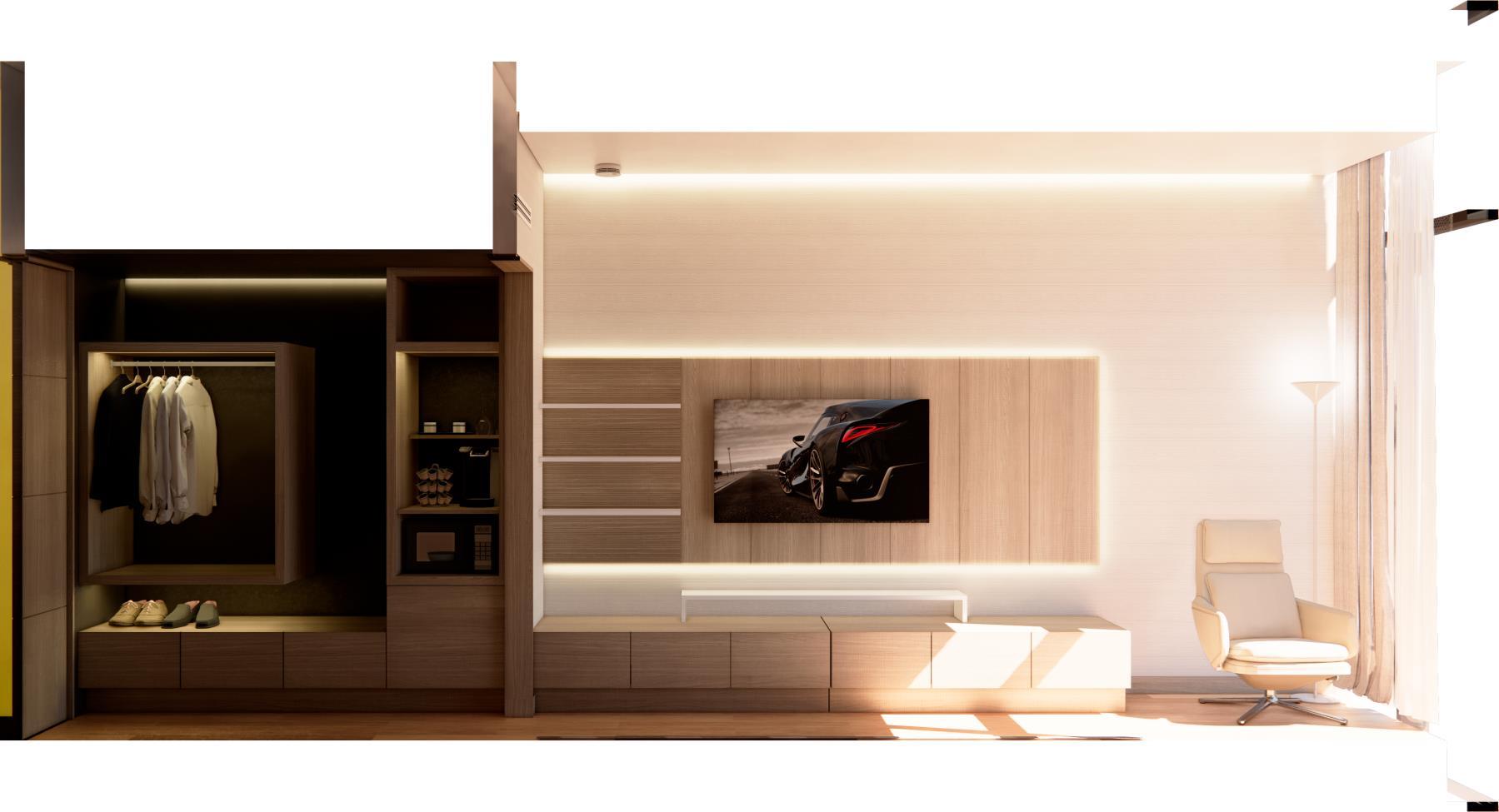 Iluminación indirecta led en plafón Pasillo Closet abierto con luz indirecta led Detector de humo Doble cancelería* Cortinas blackout Torre: Cafetera Microondas Minibar Tazas Caja fuerte Cajonera Luz led indirecta Luz led indirecta Cajonera Cajonera Sillón Mueble respaldo TV