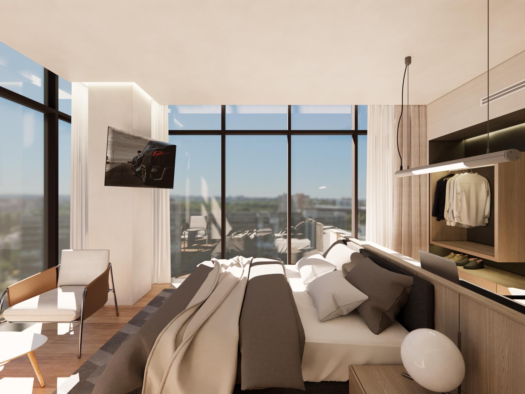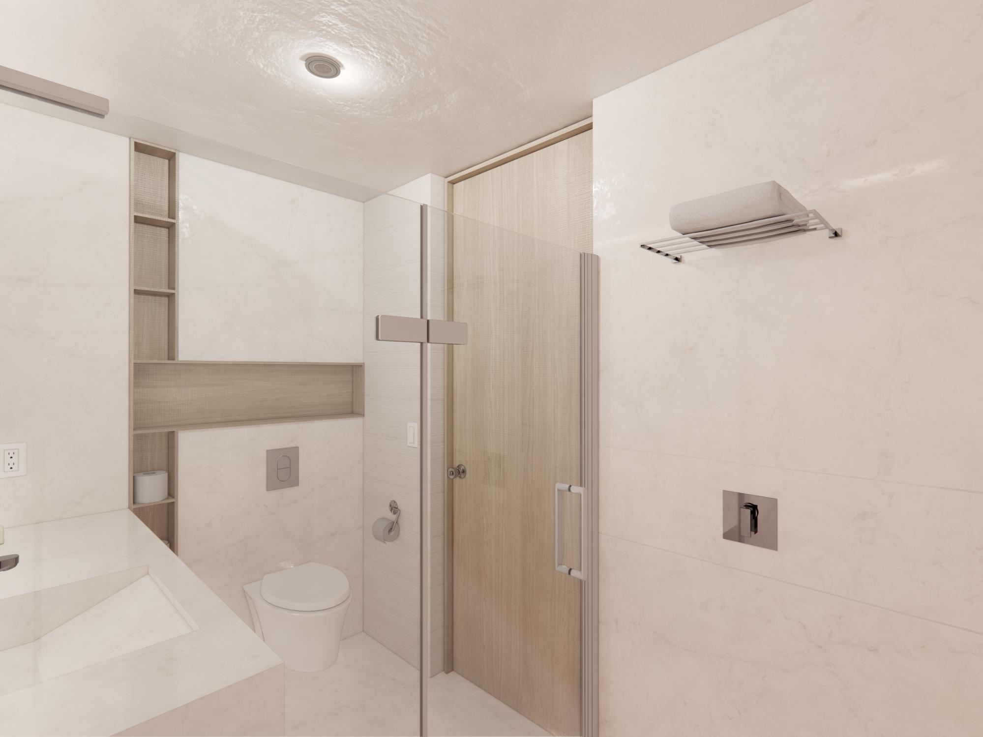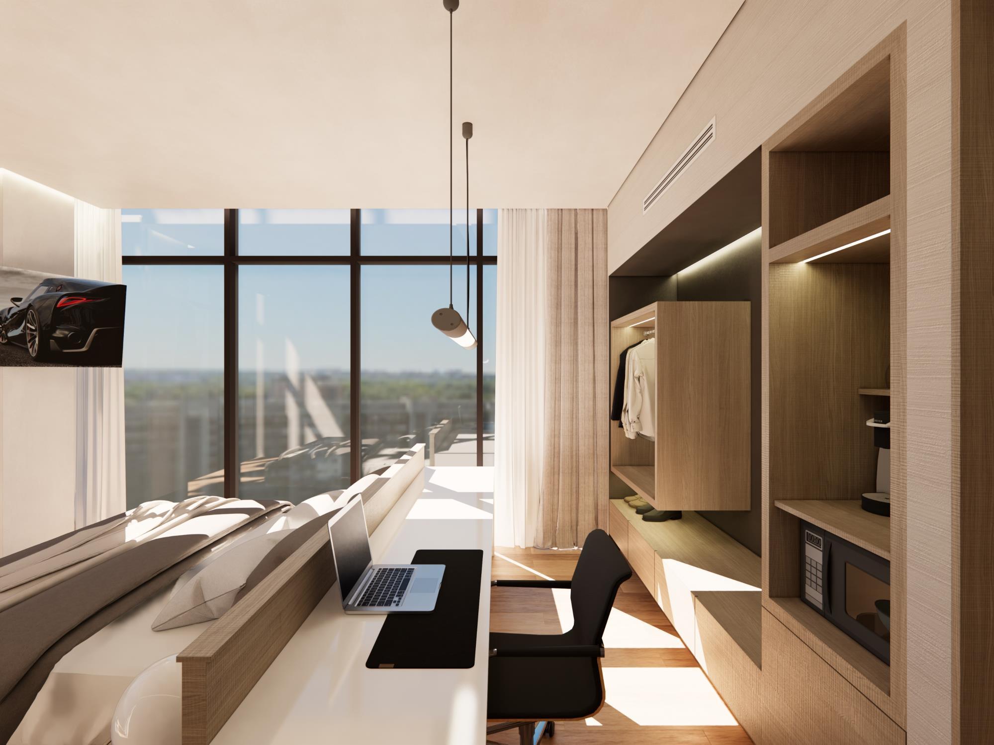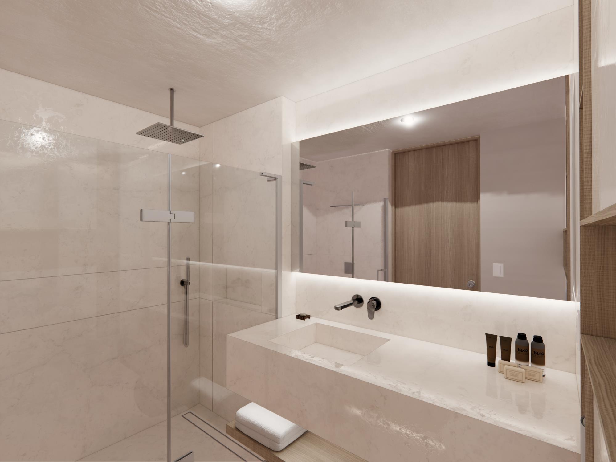 Iluminación indirecta led en plafón Pasillo Closet abierto con luz indirecta led Detector de humo Doble cancelería* Cortinas blackout Torre: Cafetera Microondas Minibar Tazas Caja fuerte Cajonera Luz led indirecta Luz led indirecta Cajonera Cajonera Sillón Mueble respaldo TV