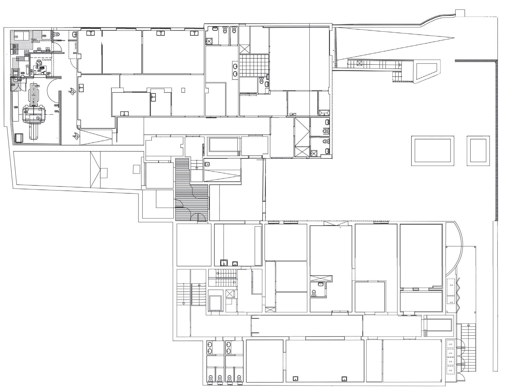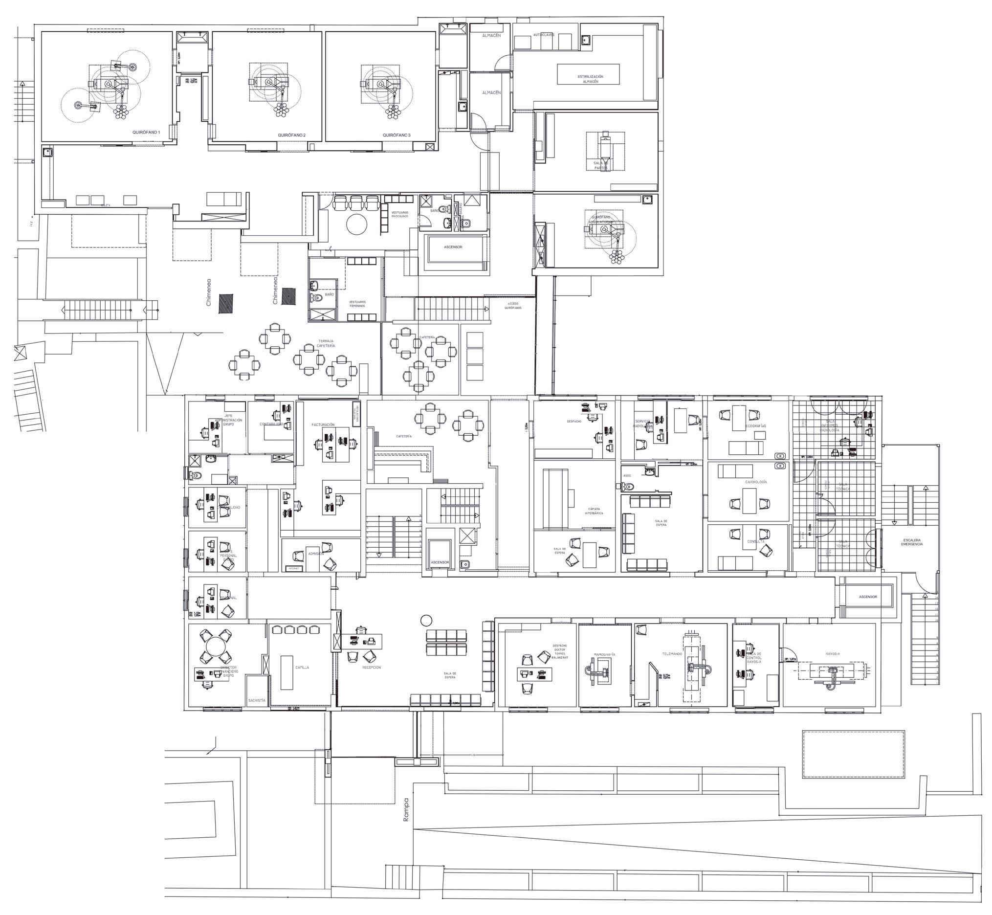• Etage 1 . (3) Haupteingang, Cafeteria und chirugisches Lager.