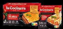 La Cocinera presenta la nueva receta de la Lasaña Boloñesa y los Canelones de Carne. Mediante esta renovación en sus dos formatos de 280g y 500g la marca ha logrado mejorar el sabor, la textura y la apariencia de ambos productos, gracias a un aumento en la cantidad de relleno y un gratinado más crujiente. Para ello, se ha equilibrado la proporción entre relleno y bechamel y se ha sustituido el queso mozzarella por el queso emmental, que aporta un mayor sabor y una textura crujiente al gratinarlo en el horno. Además, el uso de carne de cerdo 100% nacional, y de pasta fresca al huevo garantizan el estándar de calidad.