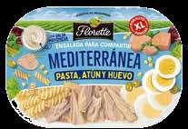 Florette presenta la ensalada Mediterránea, un nuevo formato dirigido a compartir esta receta. La ensalada combina cuatro ingredientes principales: Ensalada, pasta fusilli, atún y huevo duro. Todo ello sobre una base de vegetales frescos como la escarola, el radicchio y la zanahoria, que aportan sabor y equilibrio al conjunto. Además, el envase está fabricado con plástico 100% reciclado y reciclable.