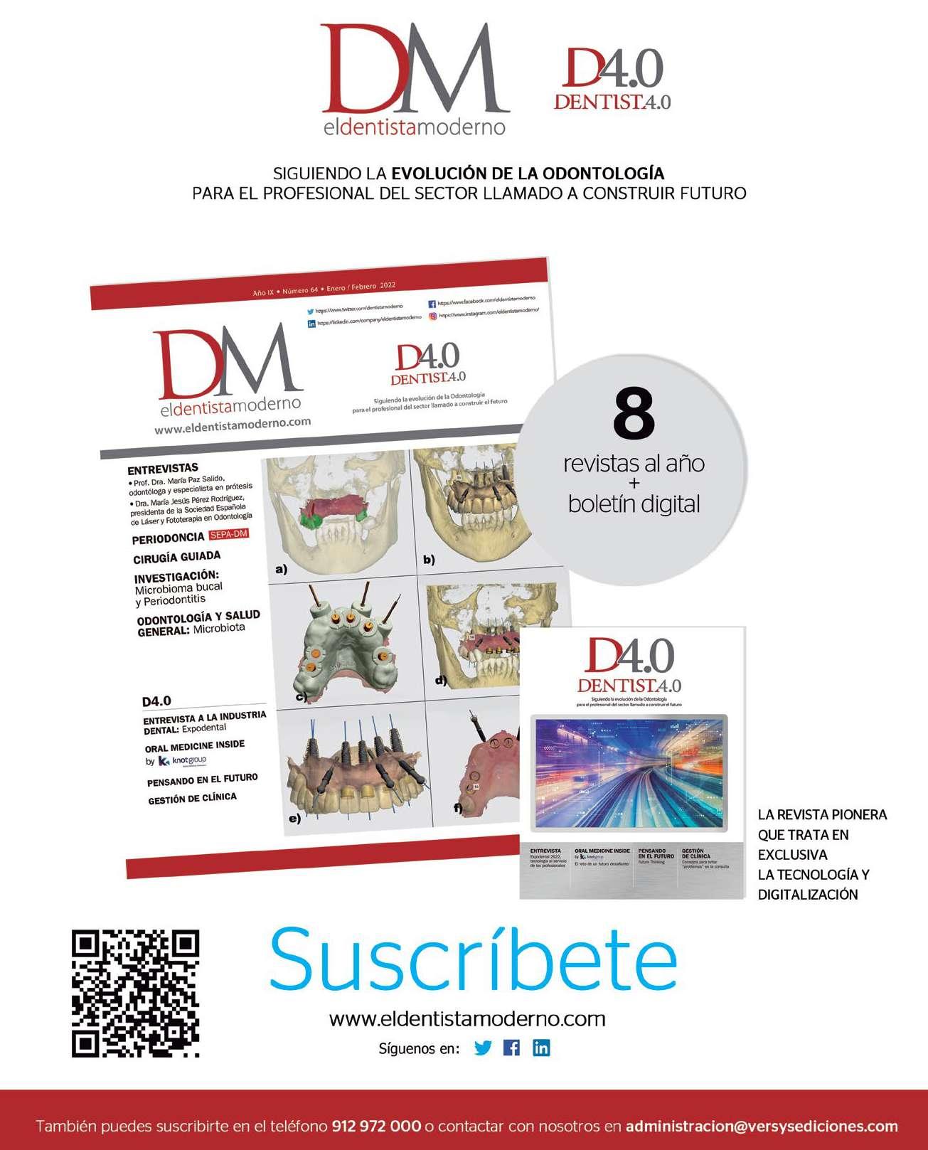 EL DENTISTA MODERNO NÚM. 77 JULIO-AGOSTO 2023 AGO ‘23 ENTREVISTAS Dr. José Vivancos y Dr. Yago Leira, del grupo de trabajo SEPA-SEN • Prof. Federico Hernández Alfaro, director del Instituto Maxilofacial de Barcelona y Catedrático y Jefe de Departamento de Cirugía Oral y Maxilofacial en la UIC Dra. Ruth Pérez Alfayate, presidenta del Comité Organizador del 43 Congreso Nacional de AEDE IMPLANTOLOGÍA OPINIÓN Cáncer oral www.eldentistamoderno.com Siguiendo la evolución de la Odontología para el profesional del sector llamado a construir el futuro N úmero 77 • Julio-Agosto 2023 @dentistamoderno @eldentistamoderno D4.0 ENTREVISTA Dr. Alfonso Gil López-Areal, especialista en periodoncia, estética dental y rehabilitación oral ORAL MEDICINE INSIDE by PENSANDO EN EL FUTURO EFP Innovation Award for Digital Solutions for Gum Health 2023