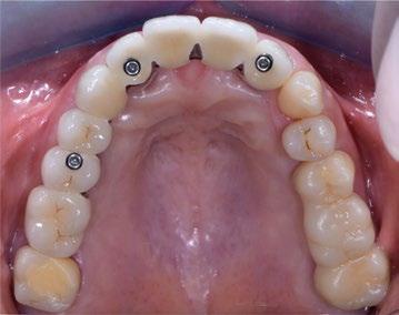 Durante la fase de osteointegración de los implantes, se dejan los dos muñones en las posiciones 11 y 21 como soporte del puente circular que se vuelve a cementar en su posición. Después de 6 meses, se extraen los dos muñones, los alvéolos se preservan y se rellenan con injerto óseoprotegido con la aplicación de una membrana reabsorbible, con el objetivo de mantener el volumen. Al mismo tiempo, se entrega una prótesis provisional atornillada en los pilares P.A.D.r, que compensa la falta de paralelismo, modela los tejidos blandos en fase de maduración a través de los perfiles protésicos y lleva la plataforma protésica a una posición más coronal. Ya a los 3 meses, es evidente cómo la presión de los perfiles ovoidales de las cabezas de los incisivos centrales ha empujado a la papila mesial a ocupar su espacio.