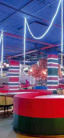6.- Los colores intensos, como regalos del universo y de la Madre Tierra a la humanidad, se unen a los revestimientos de pilares con texturas de serpientes y neones, muchos neones, creciendo desde la tierra y trepando por vigas hasta situarse en el centro de las mesas de los comensales. Como flores, esferas de espejos, multiplicando la iluminación.