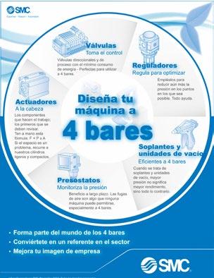 La empresa SMC colabora con los fabricantes de maquinaria en el desarrollo de máquinas energéticamente eficientes . De esta manera, los fabricantes de maquinaria diseñan habitual mente las máquinas y los equipos neumáticos para trabajar a una presión de 7 bares. Sin embargo, los usuarios pueden reducir sus costes energéticos, en algunos casos hasta un 29%, reduciendo esta presión a 4 bares. Para conseguir este resultado, cada vez un mayor número de fabricantes contacta con el equipo de especialistas con el fin de impulsar la eficiencia energética de los usuarios.