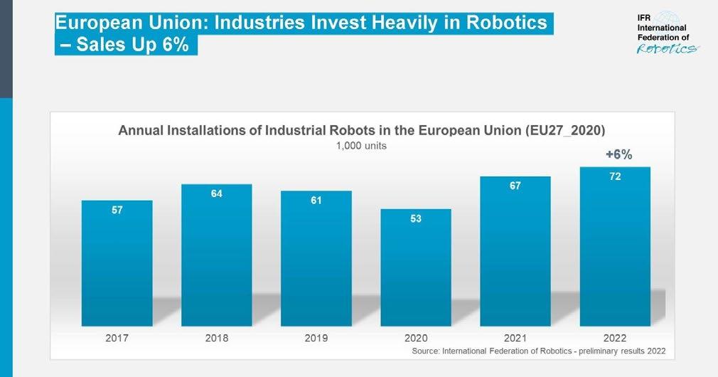 Los robots industriales en Europa siguen en aumento: los 27 estados miembro de la Unión Europea (UE) instalaron casi 72.000 unidades en 2022, un 6 % más que el año anterior. Estos son resultados preliminares, presentados por la Federación Internacional de Robótica (IFR). En la industria general, el principal cliente fue la industria del metal, que instaló 4.200 de robots industriales (+20%) en 2022, por encima del nivel previo a la pandemia que fluctuó alrededor de 3.500 unidades por año con un nivel máximo de 3.700 unidades en 2019. Las instalaciones en la industria de productos químicos y plásticos volvieron al nivel anterior a la pandemia, con un aumento del 7% a 2200 unidades en 2022.