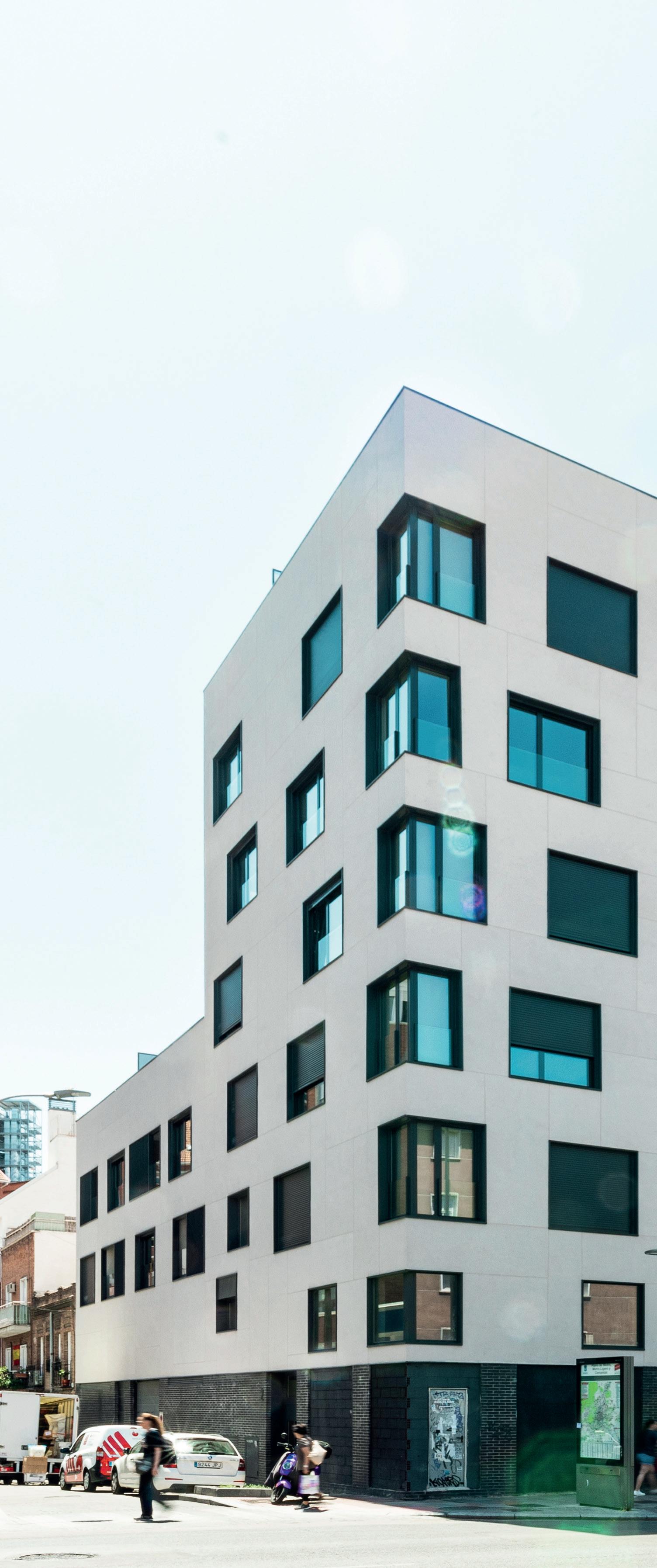 El proyecto afronta el reto de acomodar el máximo número de viviendas posibles, teniendo en cuenta las restricciones normativas de la zona. El volumen se adapta a la escala de las calles Bravo Murillo y Aníbal y responde, con su fachada, de forma distinta a cada una de ellas. La esquina del edificio se convierte en una arista casi desmaterializada mediante la disposición de ventanas en ángulo, que amplifican las vistas y aprovechan las condiciones del solar. La fachada ventilada se resuelve con paneles prefabricados con relieve, dispuestos de tal forma que su superficie cambia según la incidencia de la luz solar, convirtiéndola en un plano vivo y variable. El zócalo de chapa ondulada negra, sirve como apoyo visual y conceptual, y tras él se encuentra un gran local en esquina.