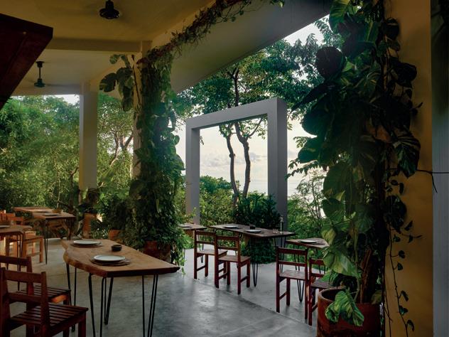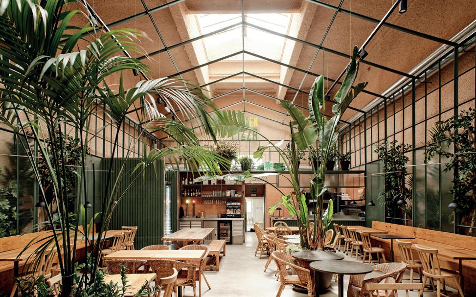 El Restaurante Jara reinterpreta la cocina tradicional mediterránea en un entorno que evoca la sensación de comer en un jardín. Un fondo blanco contrasta con baldosas cerámicas verdes y vegetación.
