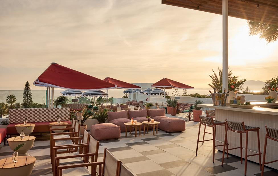 Escondido Rooftop Bar es atrevido y glamuroso, diseñado con plataformas en distintos niveles que generan zonas diferenciadas para una experiencia elevada. En el nivel superior, un elegante bar con toques setenteros—patrones geométricos audaces y tonos terracota—marca el tono de una escapada sofisticada. Al descender, una piscina panorámica, enmarcada por motivos cerámicos retro, se extiende hacia las vistas del Mediterráneo. Durante el día, el ambiente es casual y relajado; por la noche, se transforma en una experiencia elevada y sofisticada.