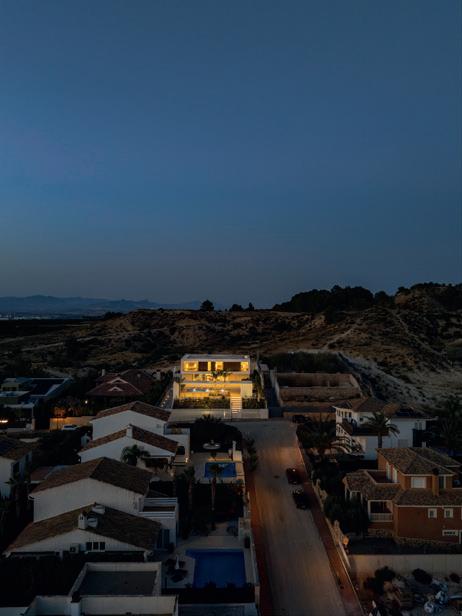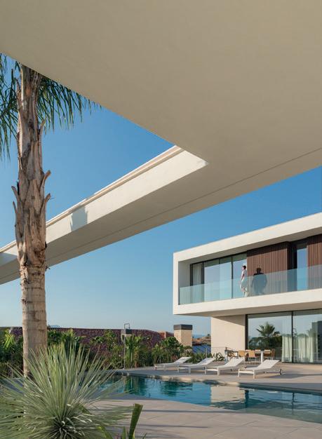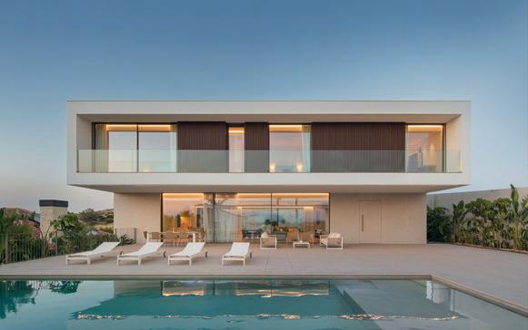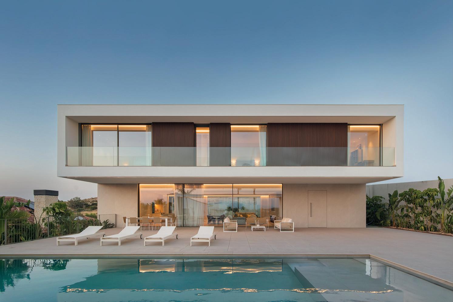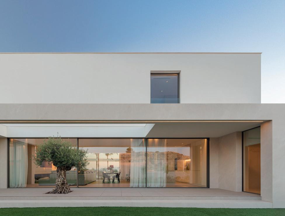 Desde fuera dibuja el volumen con rotundidad; desde dentro abre el horizonte y convierte el cielo en parte del espacio doméstico. Los materiales refuerzan la serenidad: un basamento de porcelánico sostiene un volumen blanco que parece levitar, acompañado de mallorquinas de madera que regulan el sol. La luz, el roble natural y el estuco blanco hacen de la precisión constructiva una experiencia emocional.