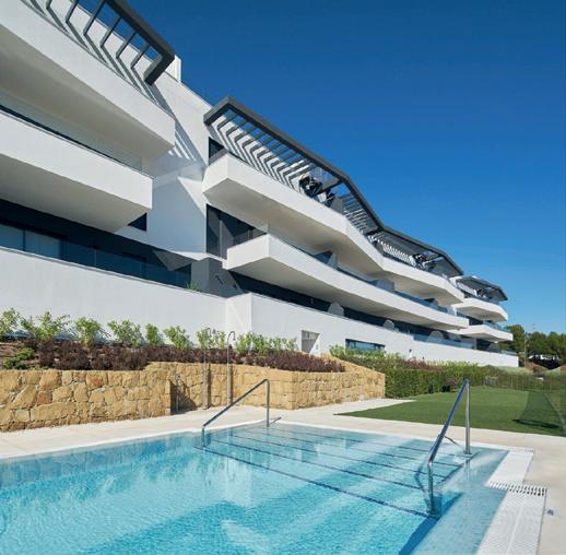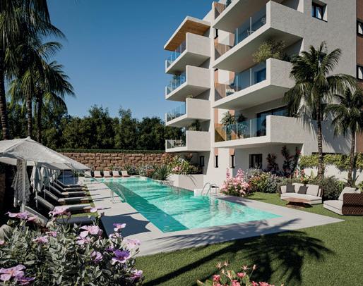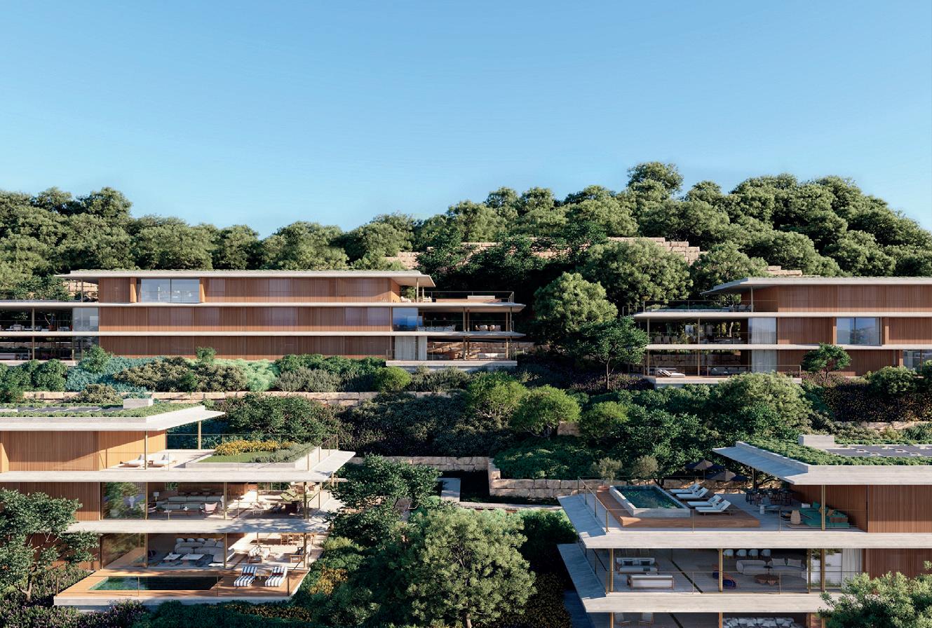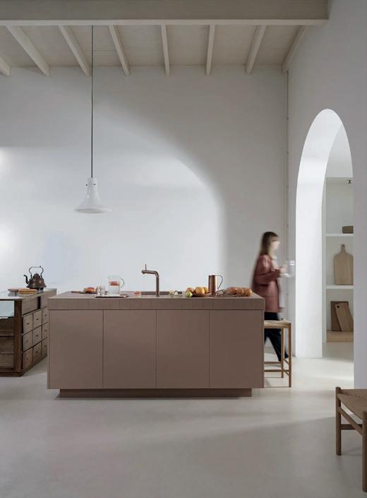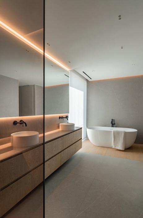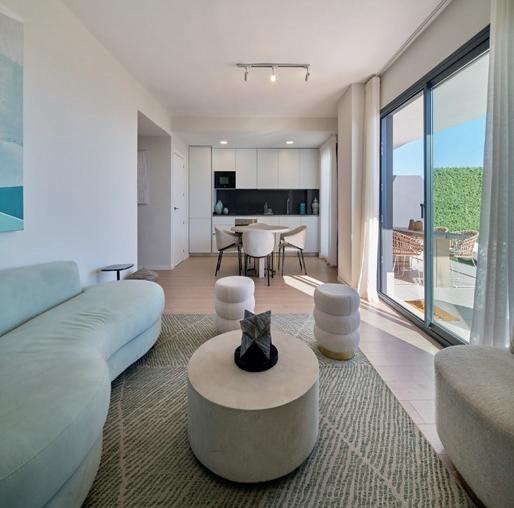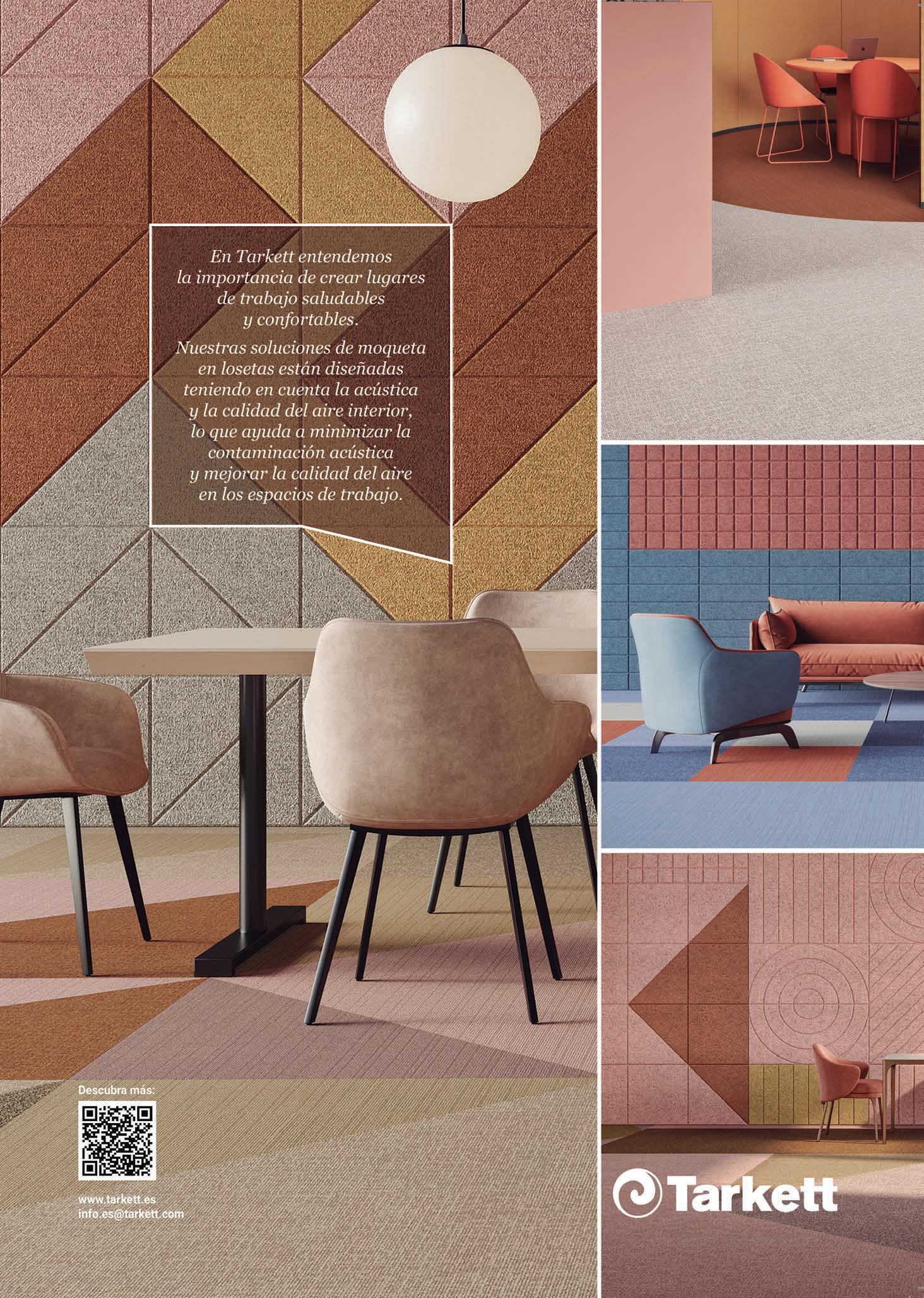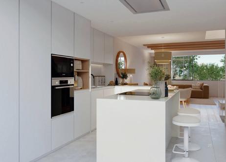 aportan riqueza táctil y visual, como maderas naturales en tonos suaves, revestimientos acanalados y telas tapizadas con terciopelos ligeros, linos texturizados y bouclé. La paleta cromática combina una base cálida y neutra con tonalidades melocotón y terracota, junto a acentos de color -turquesa, azul verdoso o teal- que aportan vitalidad y evocan al Mediterráneo.
