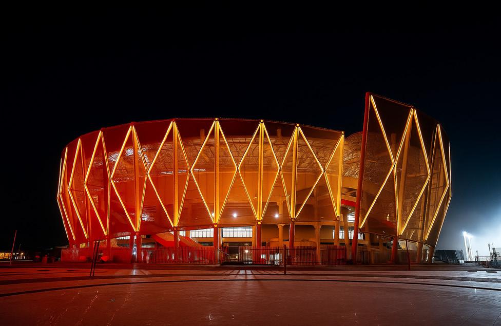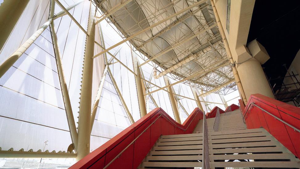 formas que funcionan como plazas de acceso y encuentro. En el interior, el graderío continuo en dos niveles garantiza una experiencia inmersiva y una gran proximidad al campo, reforzando la atmósfera envolvente ca-