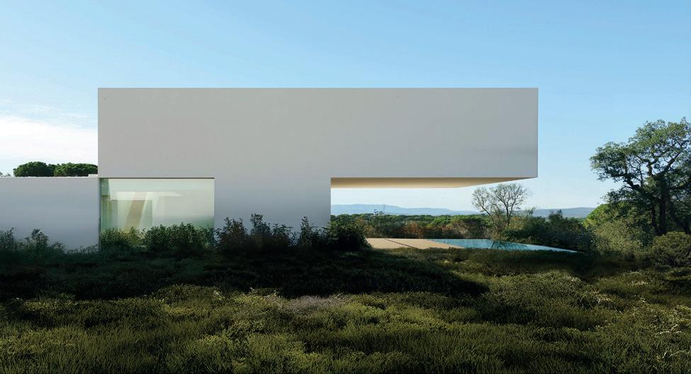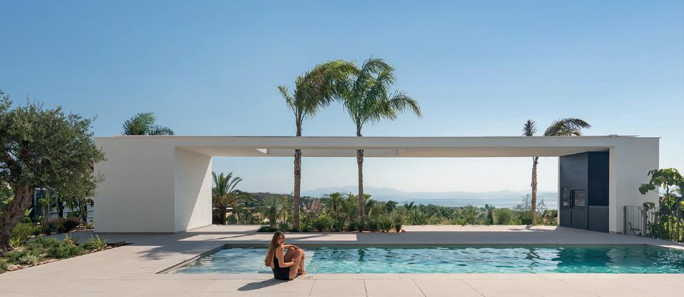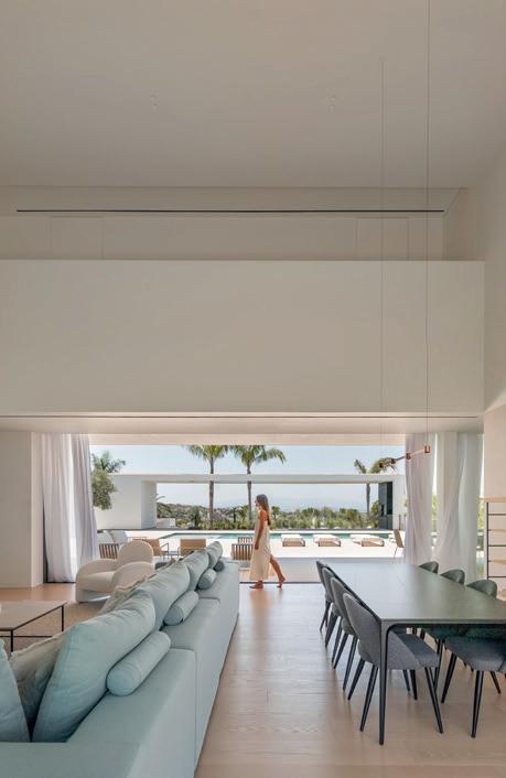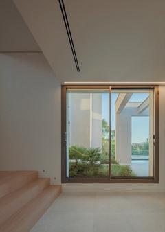 Al oeste, la energía compartida. El salón de doble altura, la cocina exterior, la piscina y los atardeceres que prolongan las horas en familia. Entre ambos polos, la planta baja se atraviesa de lado a lado, permitiendo que el aire y la luz crucen la casa como un material más. Una arquitectura que no solo observa el paisaje, sino que lo enmarca y lo convierte en parte de la vida cotidiana.