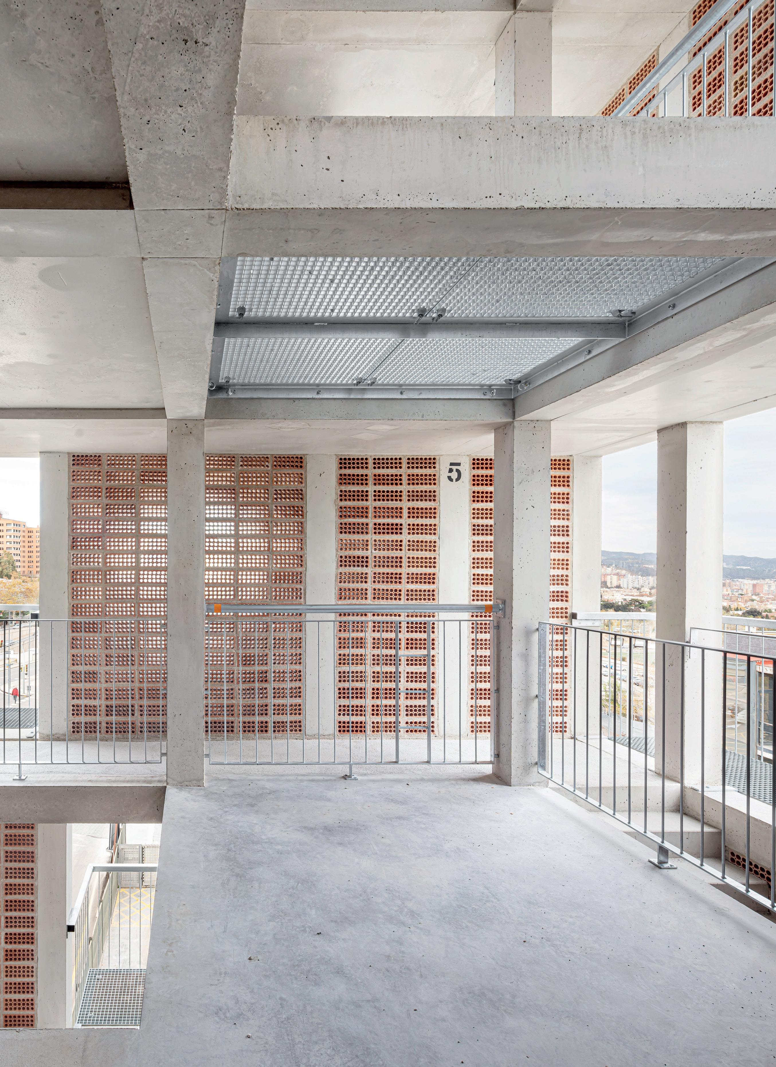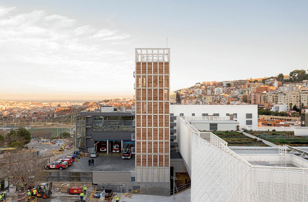 La torre de prácticas de bomberos de Vall d’Hebron plantea el reto de cumplir con los requisitos funcionales de la actividad prevista y, al mismo tiempo, permitir una integración paisajística aceptando la condición de elemento de gran visibilidad. La configuración de la torre ayuda a ordenar y cohesionar un entorno complejo ya que su materialidad conecta paisajísticamente con los barrios de Sant Genís y la Teixonera gracias al tratamiento de la fachada de obra vista, que establece un vínculo con las medianeras y las torres de viviendas presentes en el entorno más próximo.