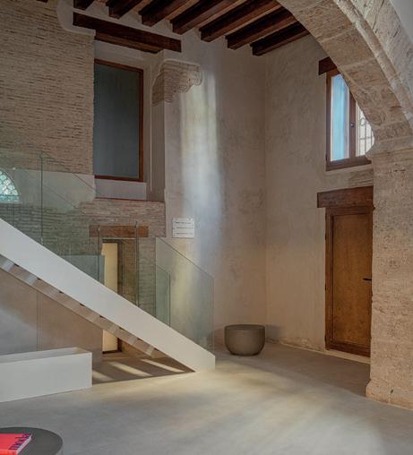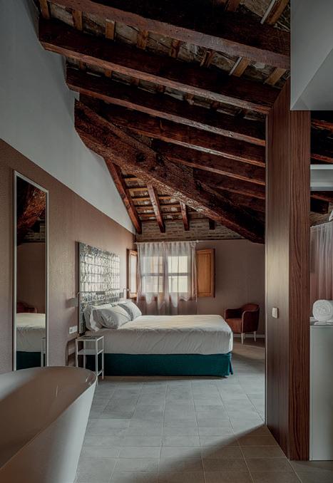 mientras que la casa histórica acoge los accesos y los usos comunes. Un hall de doble altura con arcadas de piedra, la zona de aguas y la conexión con restaurante y gimnasio articulan el conjunto. La intervención recupera la sala noble con artesonado pintado del XVI, iluminada por un tragaluz con delicados entallados de escayola, elimina añadidos impropios y revela las distintas capas históricas, restitu-