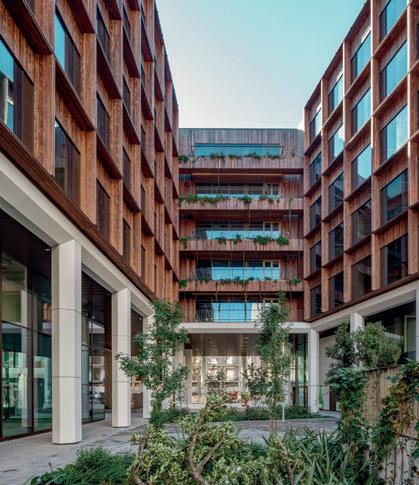 casco antiguo sevillano. La fachada de líneas elegantes emplea materiales atemporales –como piedra natural y detalles de bronce– integrándose armónicamente en la plaza peatonal circundante. La base del edificio cuenta con una pérgola de aluminio anodizado color bronce que une las dos estructuras preexistentes, en guiño a los toldos tradicionales.