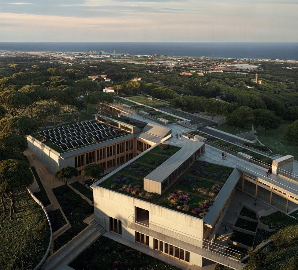La arquitectura se apoya en un podio topográfico que segrega flujos y libera amplios espacios públicos, articulados en plata-