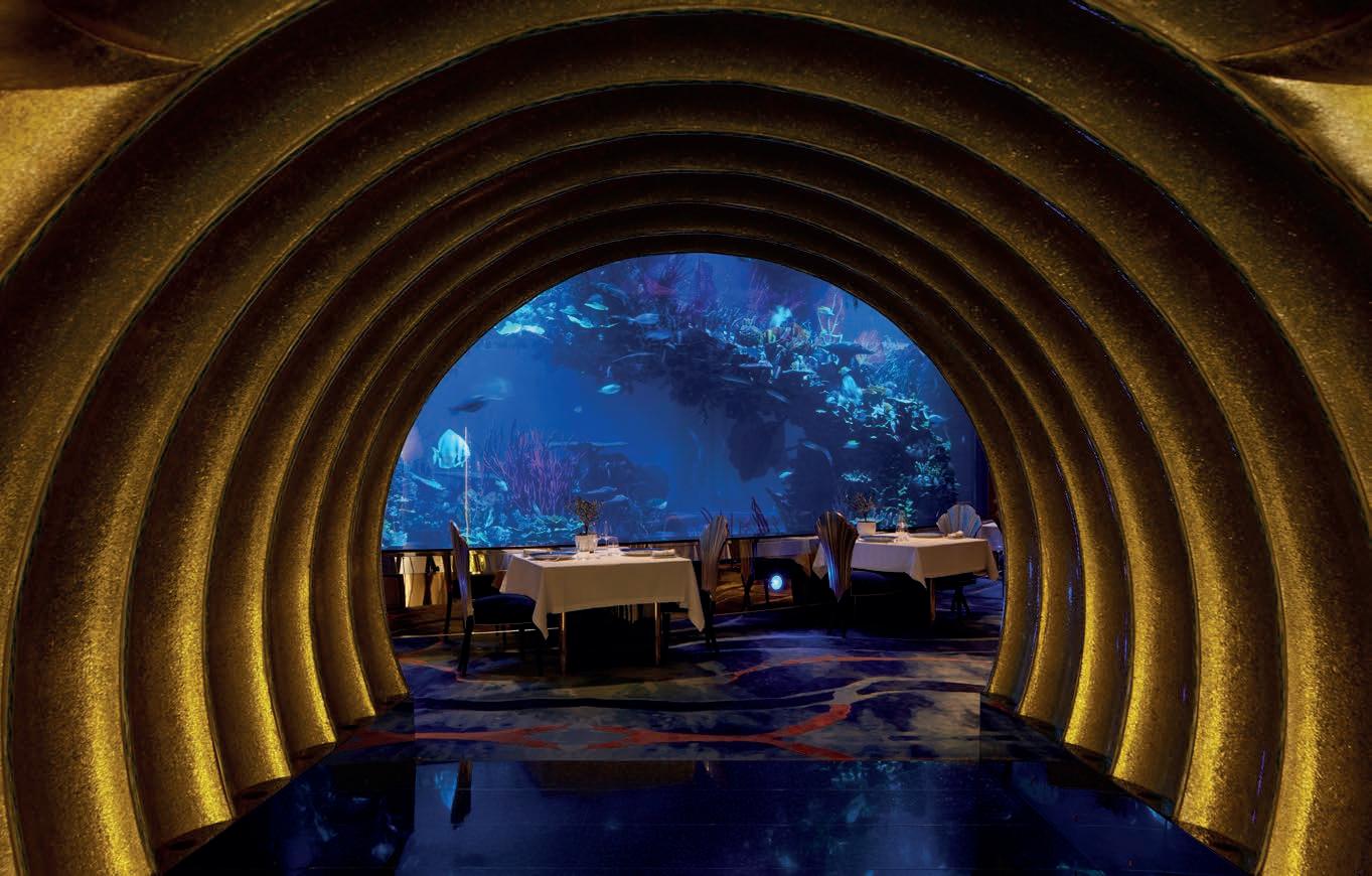 Take a seat at your table among coral-flled aquariums and sample the fsh dishes masterfully prepared by chef Andrea Migliaccio of Ristorante L’Olivo at the spectacular Al Mahara in Burj Al Arab. The seafaring atmo-