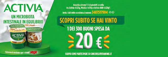 *in un unico Documento d’Acquisto. Partecipa al concorso “Con Activia vinci la spesa Vegè” valido dal 06/09/2023 al 21/09/2023. Acquista in un unico Documento d’Acquisto parlante almeno 5€ (al netto degli sconti) a scelta tra Activia 4x125g, Activia Mix&Go 1x170g e Activia Kefir 1x320g a scelta tra i gusti disponibili e secondo disponibilità, in uno dei punti vendita fisici delle insegne aderenti. Invia un SMS oppure un messaggio WhatsApp al numero 3487517904 e scopri se hai vinto. Conserva il Documento d’Acquisto. Costi SMS, WhatsApp a carico del partecipante. Riservato ai maggiorenni. Totale montepremi € 6.000,00. Per info, insegne aderenti, dettaglio premi e messaggio da inviare, consulta il regolamento completo su concorsi.vividanone.it.