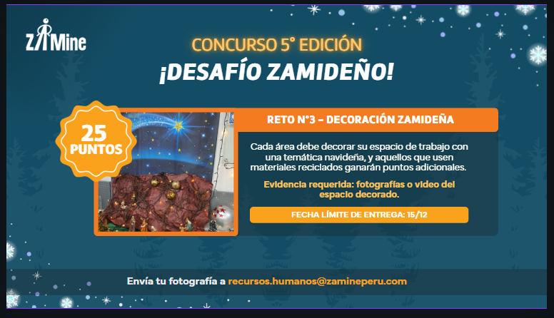 En paralelo, la creatividad y la participación se hicieron presentes a través del concurso Dibujando con Zaminito 2025, donde los hijos de nuestros trabajadores plasmaron el espíritu navideño, y la 5.ª edición del ¡Desafío Zamideño!, que invitó a los equipos a compartir evidencias que fortalecen su identidad y la cultura interna.