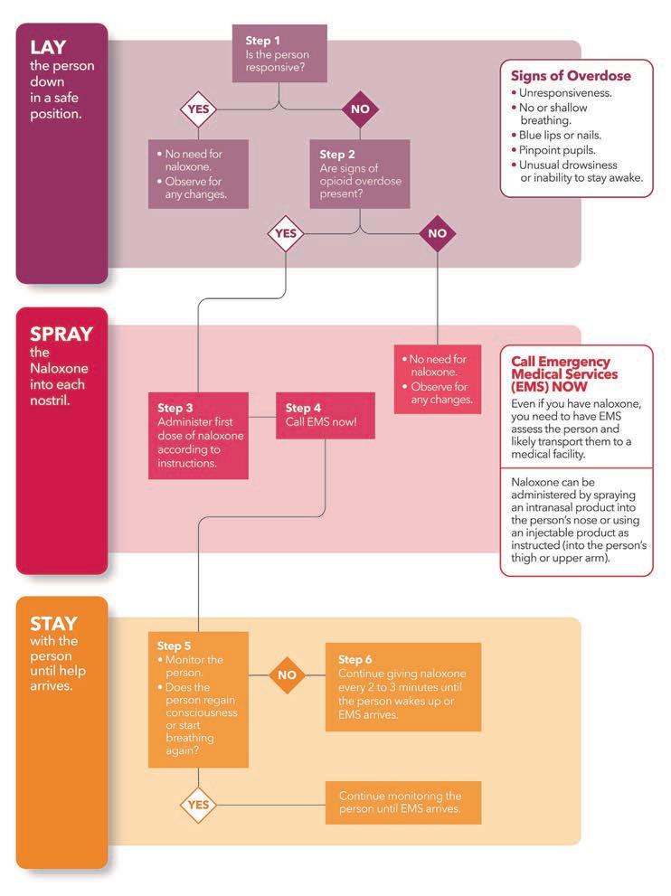 As shown in the decision tree on page 30, signs of potential opioid overdoses include excessive sleepiness or trouble staying awake, walking, or talking. Other signs of an overdose are slow or shallow breathing, snoring or gurgling sounds, pale or cold skin, blue lips or fingernails, or constricted (small) pupils. If these signs are present, call the person’s name loudly, shake them, and rub your knuckles on their sternum (center chest) to try and wake them up.