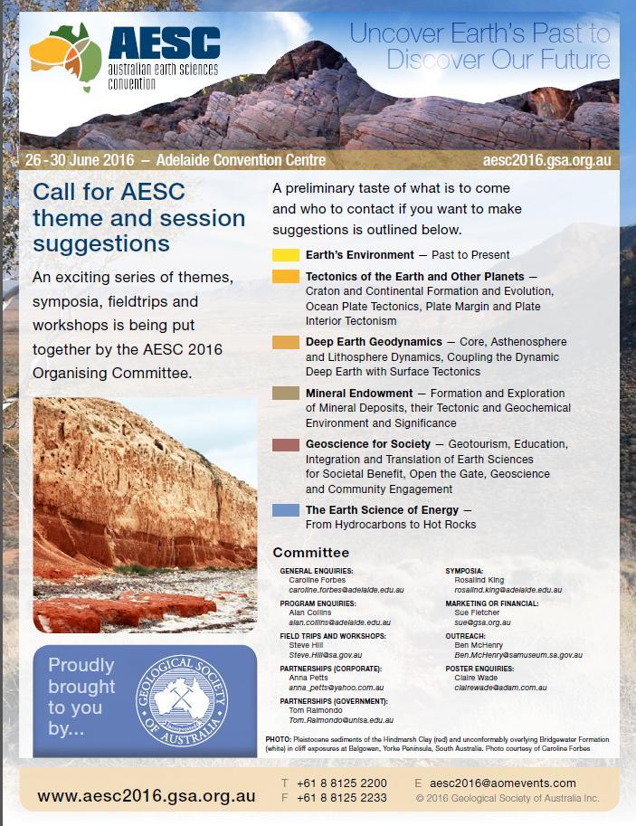 The website for AESC in Adelaide (26–30 June 2016) www.aesc2016.gsa.org.au is live and a flier is appended to the end of this newsletter. The email address in the flier: aesc2016@aomevents.com is the official convention email address managed by All Occasions Events and is also live