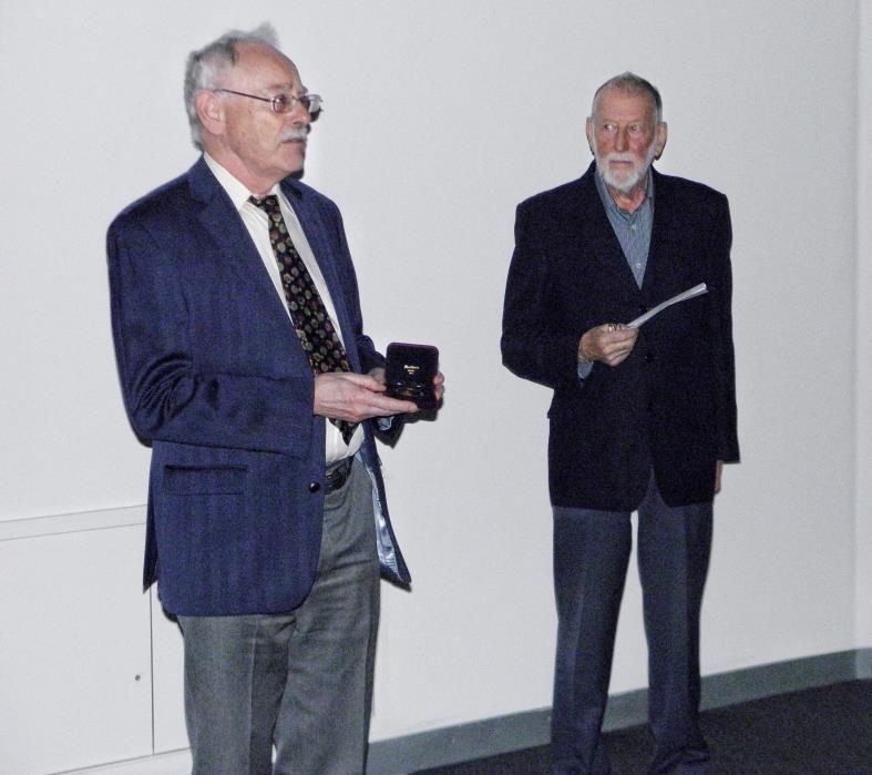 Tom Darragh responding to his award with Bernie Joyce looking on (photograph by Michelle Grosser, Secretary of the Victorian Division).