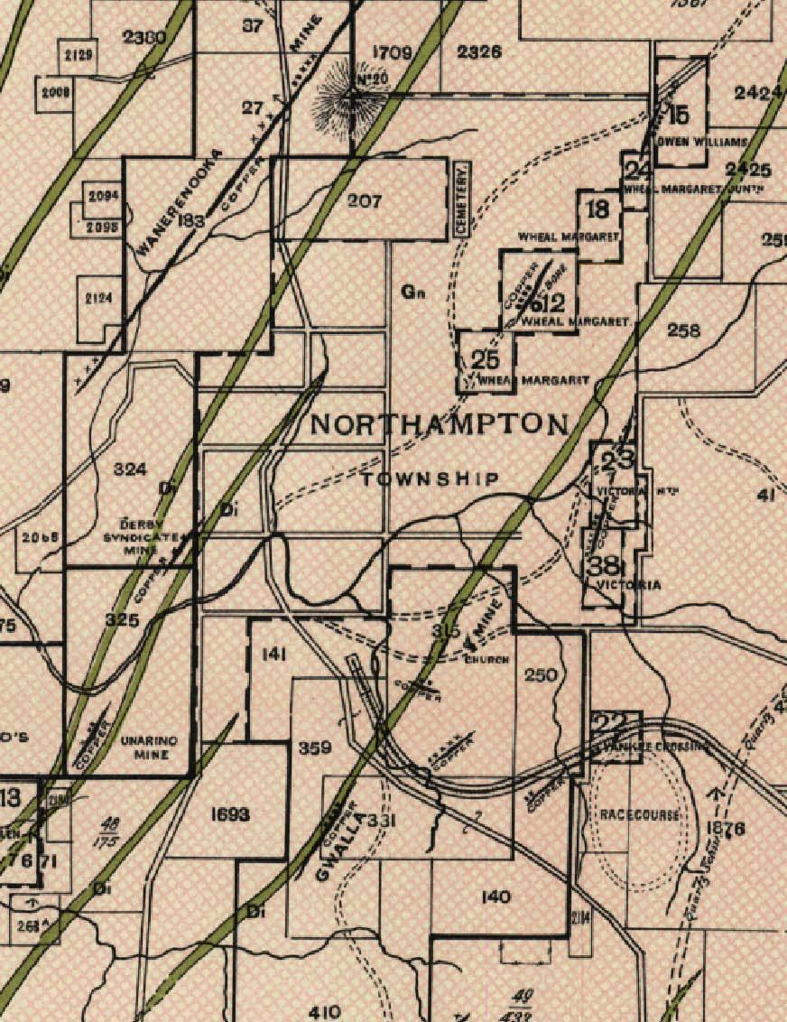 Most of the 80 or so mines worked in the Northampton field were discovered before 1890. About a quarter of these were worked principally for copper and the remainder for lead, or in a couple of cases, for both metals. The mineralisation filled open fissures and fault breccias formed mainly on north-northeast striking faults cutting garnet granulite and gneiss. Many of the lodes followed the contacts of dolerite dykes intruded along the same NNE fracture system, but predating the mineralisation by at least 100 million years (Richards et al., 1985).