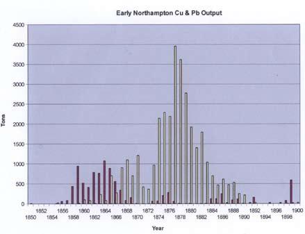 The early phase of mining in the Northampton Mineral Field took place before systematic records of mineral production were kept in Western Australia (these statistics only began to be collected when the Department of Mines was established in 1899). However, Customs records collated by Maitland (1903) indicate that from 1850 to 1899 about 9000 tons (tonnages have not been converted to metric tonnes) of copper ore and 33 500 tons of lead ore was shipped from the field. The contained metal in these shipments has been estimated as about 1800 tons of Cu (Marston, 1979) and 20 000 to 23 000 tons of Pb (Blockley, 1971). In addition, some 600 tons of pig lead was exported, mainly from the Warribanno smelter. Most copper production took place in the 1860s, declining rapidly after 1868 as prices fell and the richer oxidised ores were depleted. Lead ore output peaked at about 4000 tons in 1878, then fell rapidly over the next decade, to almost nothing in the 1890s (Fig. 6). Woodward (1895) attributes the fall in copper prices to the increasing preference for steel-hulled ships rather than copper-sheathed wooden vessels.