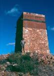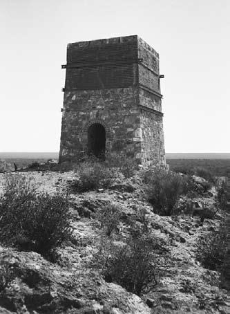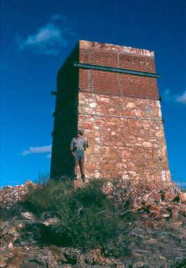 The Warribanno chimney in the Murchison region marks the site of Western Australia’s first metallurgical enterprise. It was built in 1853 to smelt lead ores from the Geraldine and other mines near the Murchison River. The chimney, which was originally several metres taller, sits over a vertical shaft that connects to a draft tunnel driven in from near the bottom of the hill. Ore and fuel were fed into the smelter through a window at the base of the chimney (see Figure 3 of leading article) and the molten lead tapped via the tunnel (photo by Roger Hocking, Geological Survey of Western Australia)