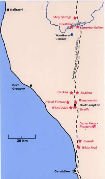 of Geraldton. In 1852, a shepherd working on the property discovered copper ore, which after some delay in raising capital, was developed in 1855. In the same year more copper was found at Wanerenooka Hill, about 32 km further north. Title to the deposit was obtained by James Drummond Jr, and production began in 1856 (Erickson, 1969). While the White Peak mine proved to be short-lived and unprofitable, the Wanerenooka deposit and others of copper and lead found nearby, gave rise to a flourishing mining industry. The more important of these copper mines, apart from Wanerenooka, were the Gwalla, Wheal Fortune, and Wheal Margaret, whereas the larger lead mines were Baddera, Wheal Ellen and Wheal Fortune Extended. Another important deposit of copper was located at
