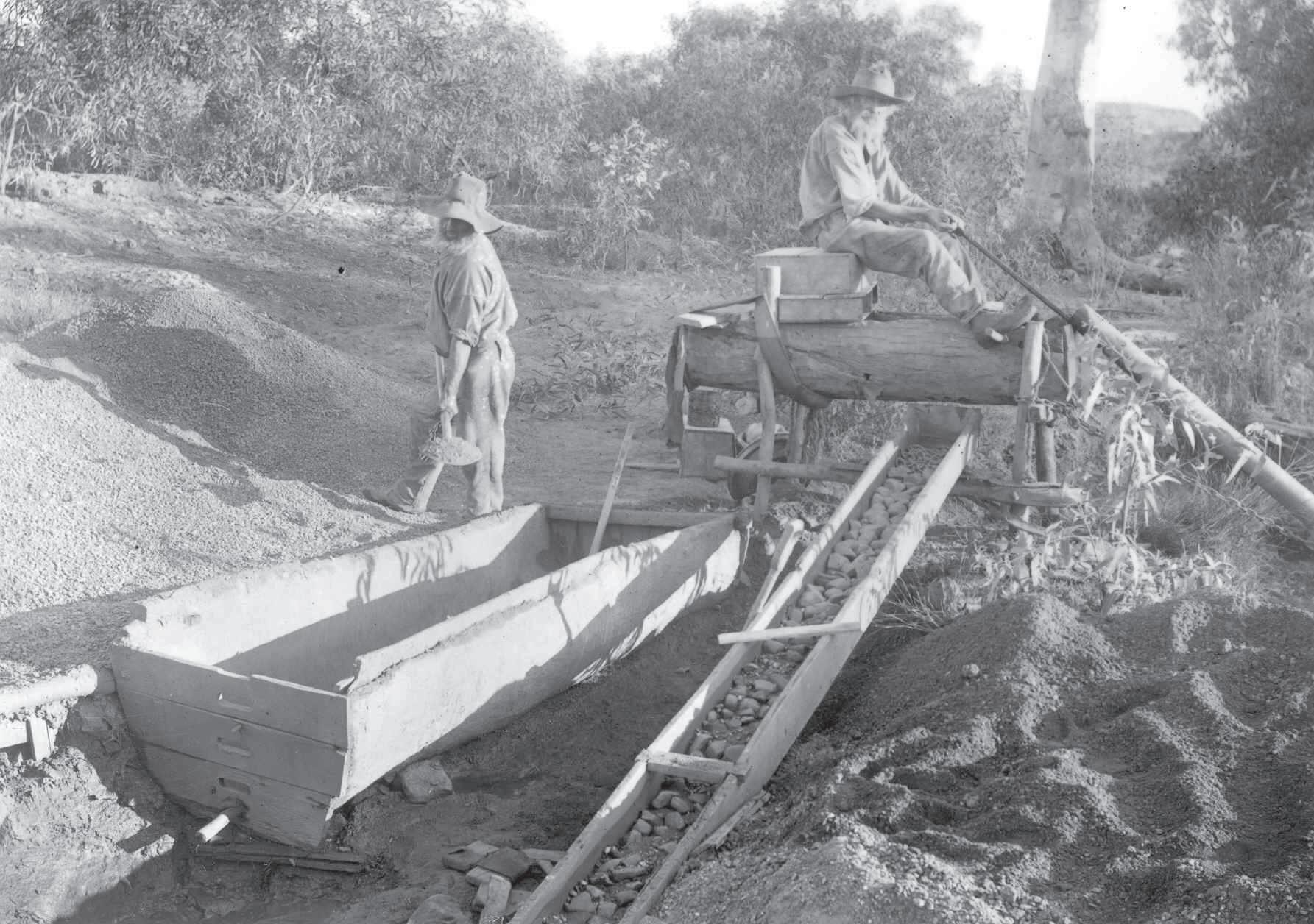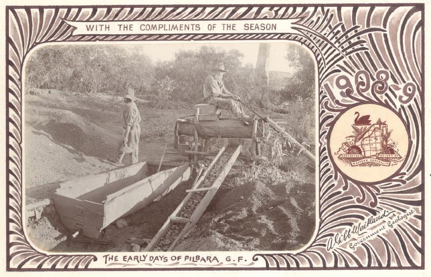 The earliest photos that can be assigned a reliable date were taken by Topographical Surveyor Septimus J. Becher who had also served as a Mines Inspector (Becher, 1896). Although only 12 in number, they show the state of mining at Marble Bar and Nullagine in 1896. Of particular historical interest are his shots of two miners sluicing alluvial dirt at Nullagine, and of the workings in the “Nullagine Conglomerate”, now the Beatons Creek Member of the Hardey Formation (Figures 1 and 2).