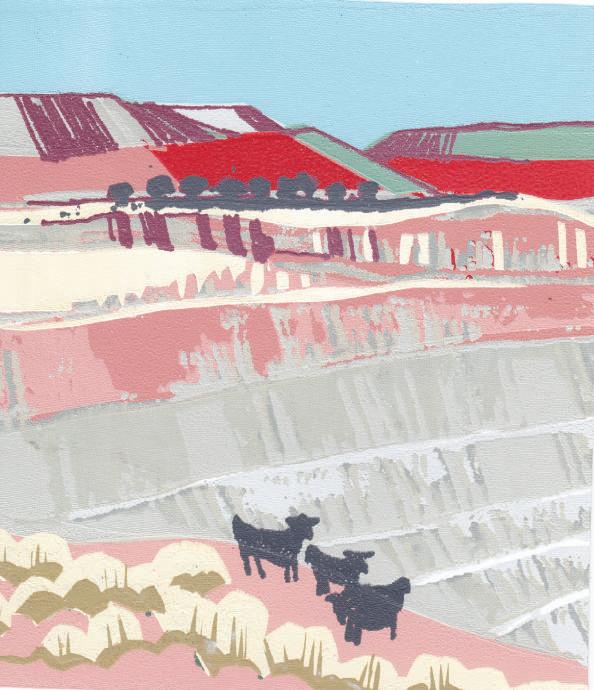 Figure 5 Western Australian artist Lyn Barry’s lino-cut print showing the Sons of Gwalia open pit in about 2005. She wondered what the goats were finding to eat in that rather barren landscape! Image used with the artist’s permission.