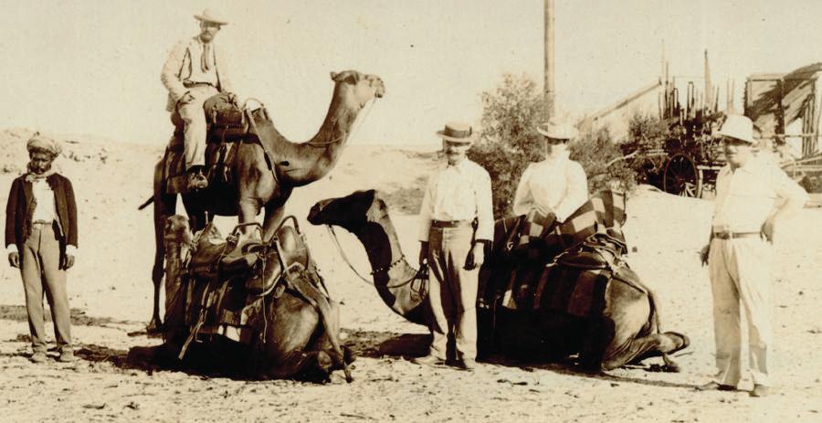 mapping large tracts of the Western Australian interior from the backs of camels or horses. Of these, about 52 recorded his 1908 trip along the Canning Stock Route where he joined Canning’s well-sinking party (Talbot, 1910). In 1906, Surveyor Alfred Canning had been given the task of establishing a practicable stock route from the east Kimberley region across about 1800 km of desert to Wiluna to provide cattle for the markets in the Eastern Goldfields. This enterprise was intended to break the monopoly of supply from the west Kimberley, which kept prices high. Also, the long trip was predicted to kill off disease-bearing ticks that it was feared would infest cattle from other areas. He and his party surveyed the route during 1906-07, and in 1908 began work on sinking and equipping wells to provide water for the drovers at regular intervals. Much of the route crossed country that was completely unknown geologically, and Talbot was assigned the job of mapping a strip up to 250 km wide along its course. So that he could make excursions away from the main party, he was provided with two riding camels and an assistant. When leaving the main party, the camels carried provisions to last four to five weeks and about 55 litres of water, along with their riders. Typically Talbot would leave the main party at one well and rejoin it at another further north along the stock route after carrying out reconnaissance to the east or west. The